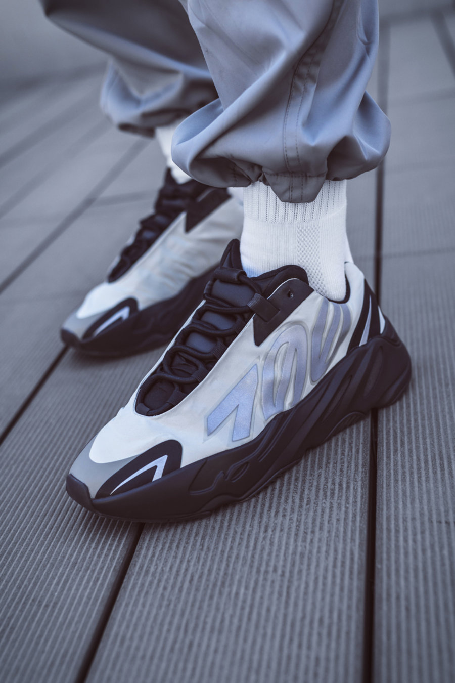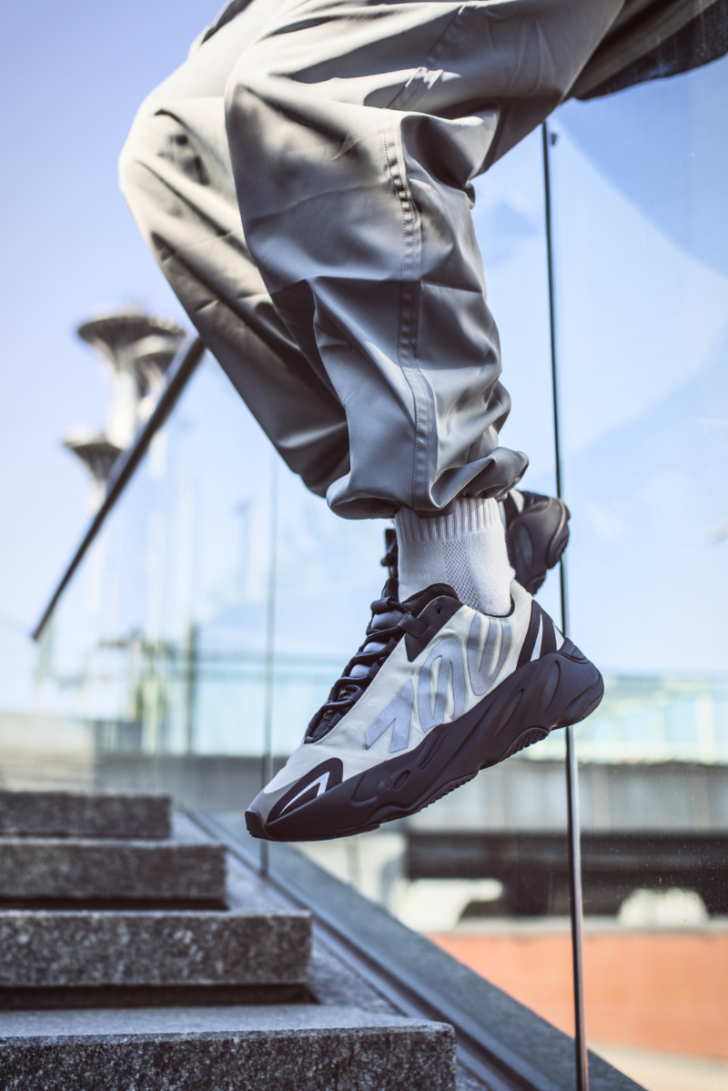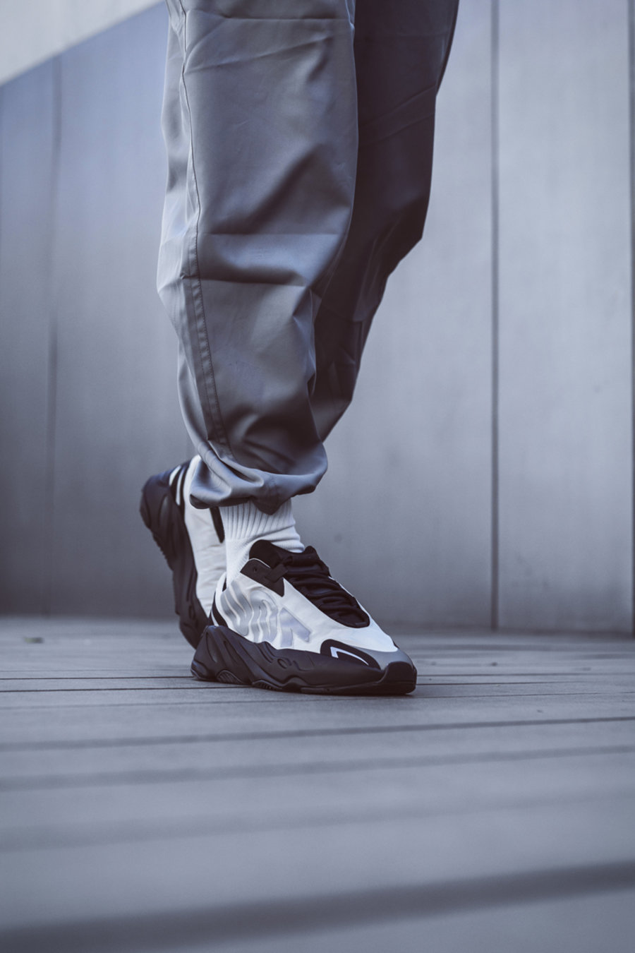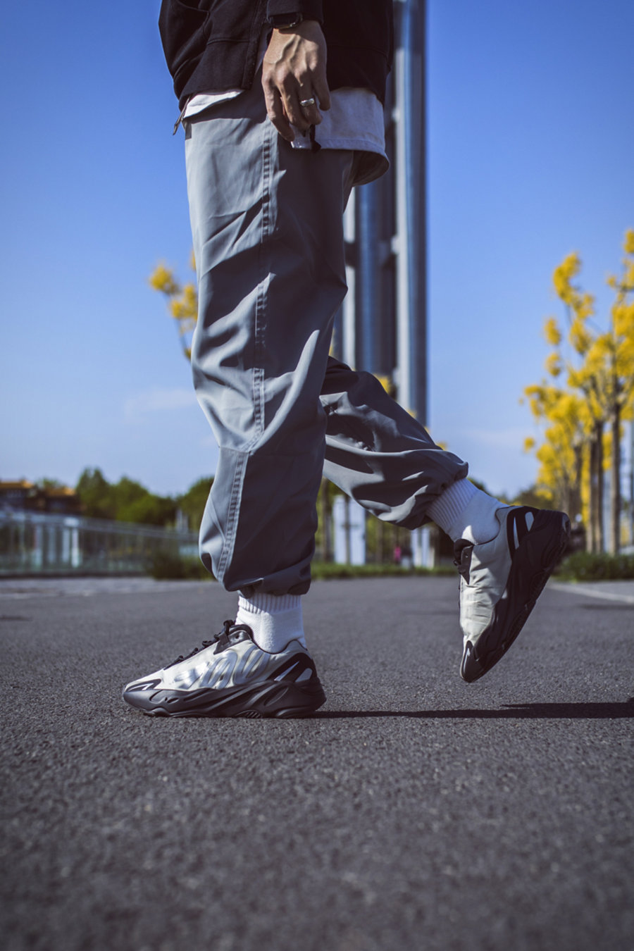 灰白 + 黑色装扮,与简洁前卫的鞋型相得益彰。可能是目前 Yeezy 700 MNVN 最实穿配色。