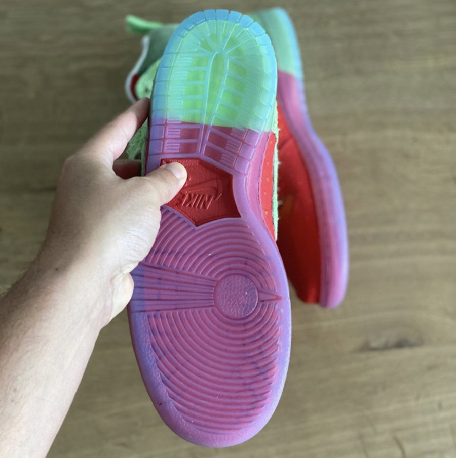 此前,一款咳嗽草莓配色 Dunk SB High 曝光,有消息称是今年的 420 新配色。