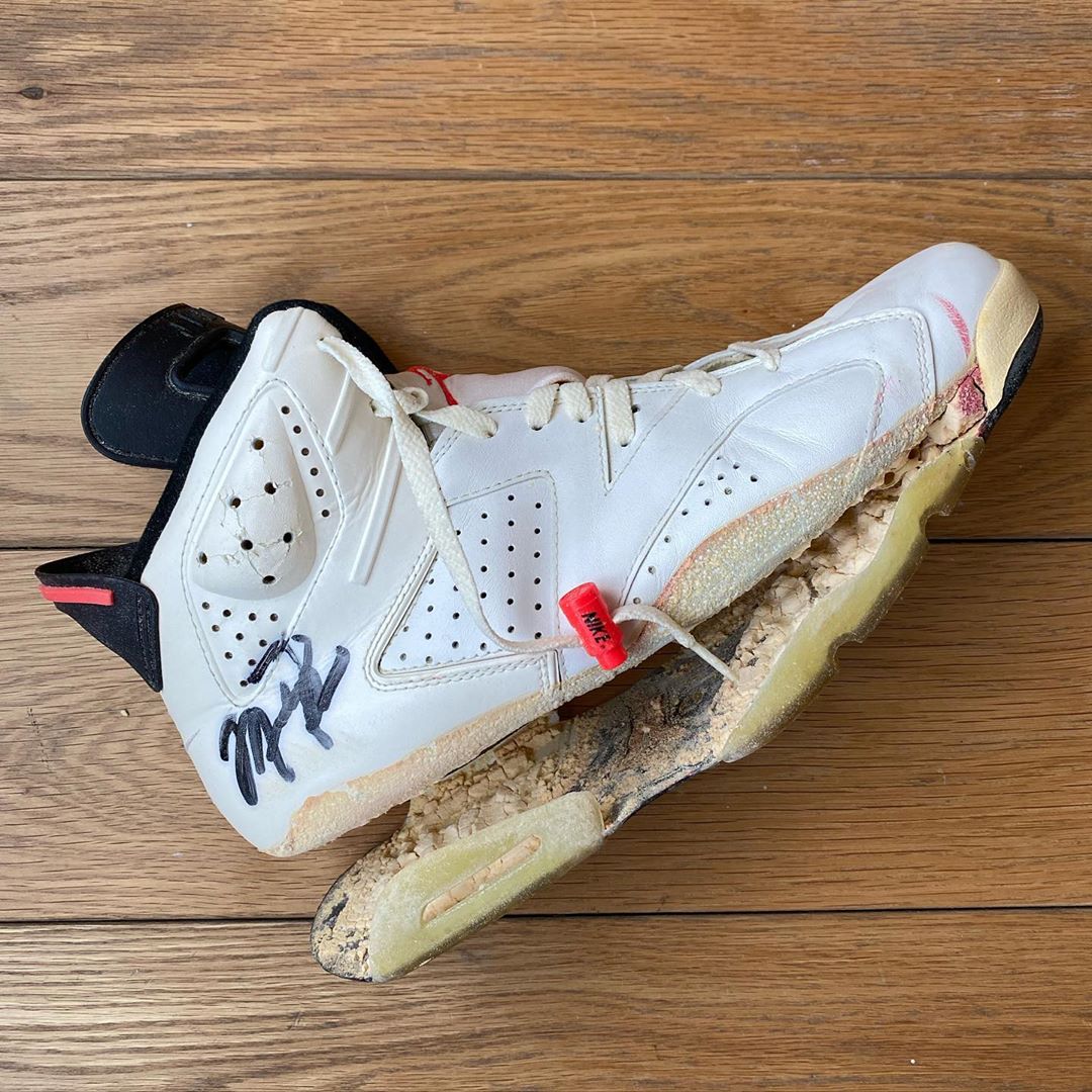 可以看到 Air Jordan 4 白水泥的中底已经开始有粉化的迹象,而 Air Jordan 6 白红已经掉底了。