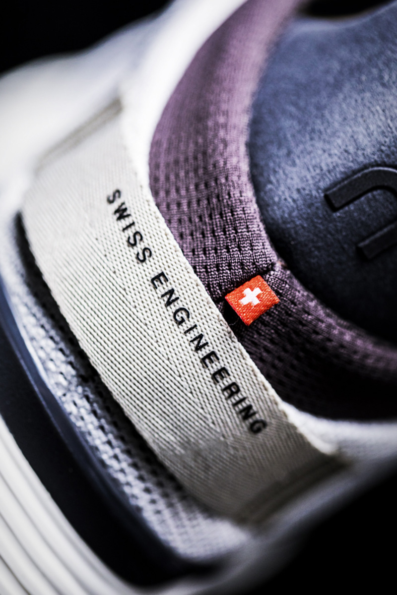 后跟处辅以刺绣以及瑞士国旗的织唛设计点缀,“SWISS ENGINEERING” 字样更体现出了瑞士精工的作风。