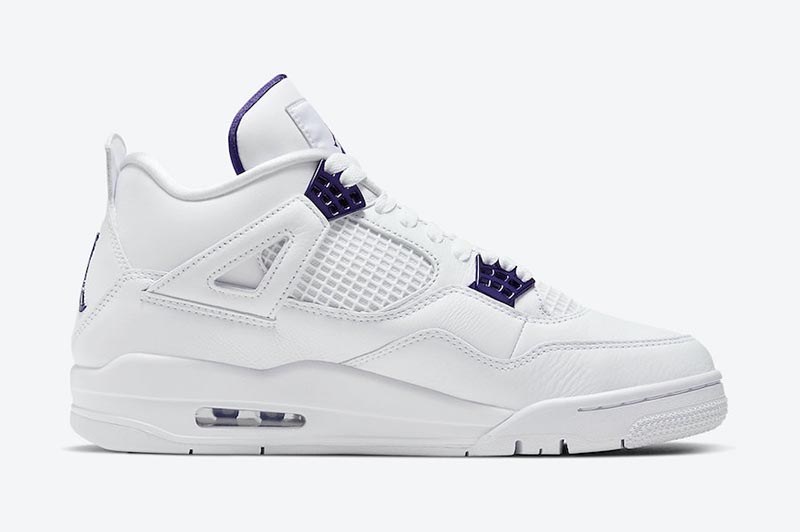 近期 Jordan Brand 一口气带来 4 款金属质感的纯白 Air Jordan 4,眼前这款白紫装扮带来炫目电光紫的夺目效果,继此前上脚美图提前曝光后,官方图片已随之浮现网络。