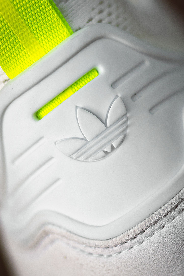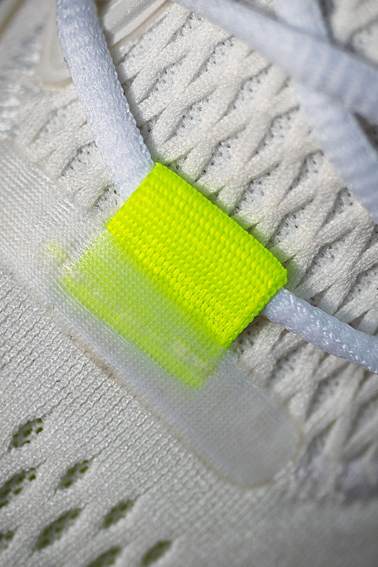 鞋带底端采用热熔贴片固定,白色款应用亮眼荧光黄色装饰,呼应整双鞋的配色。