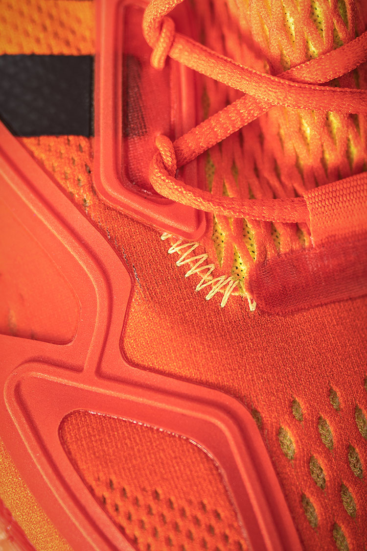 另外一款配色则采用橙红色打造,鞋头的红色逐渐渐变至鞋尾的荧光黄色,体现出夏日特有的热情。