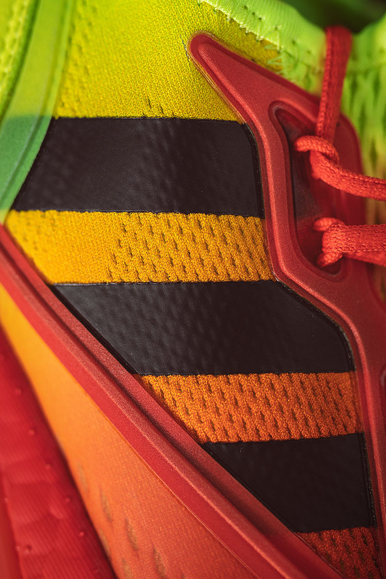 侧身标志性 adidas 三线 Logo 采用热熔工艺处理,同时在红色配色中可以明显看出鞋身中部的渐变效果。