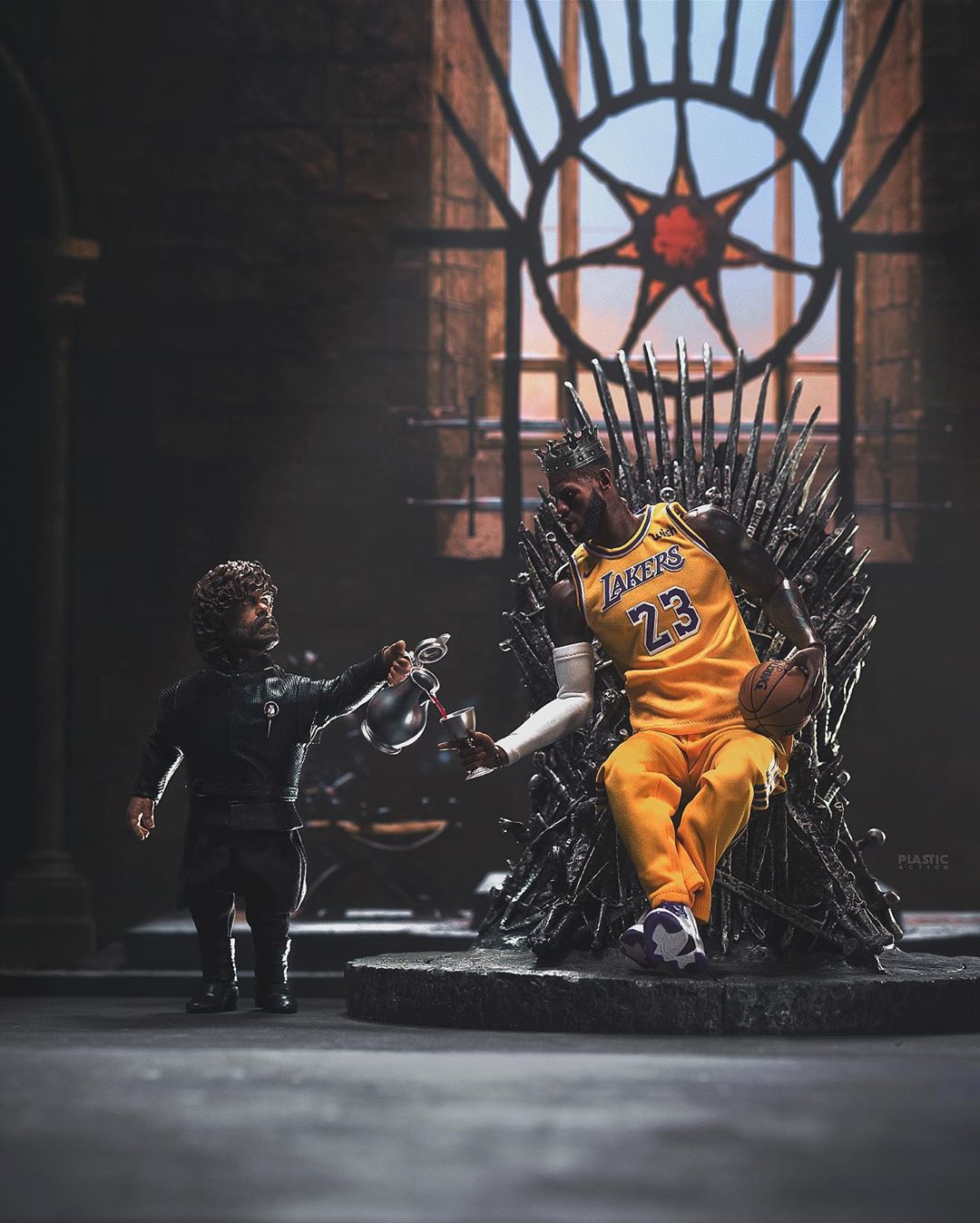 单手拿着奥布莱恩杯扣篮的詹姆斯、坐在铁王座上的詹姆斯,还有詹姆斯的经典盖帽...
