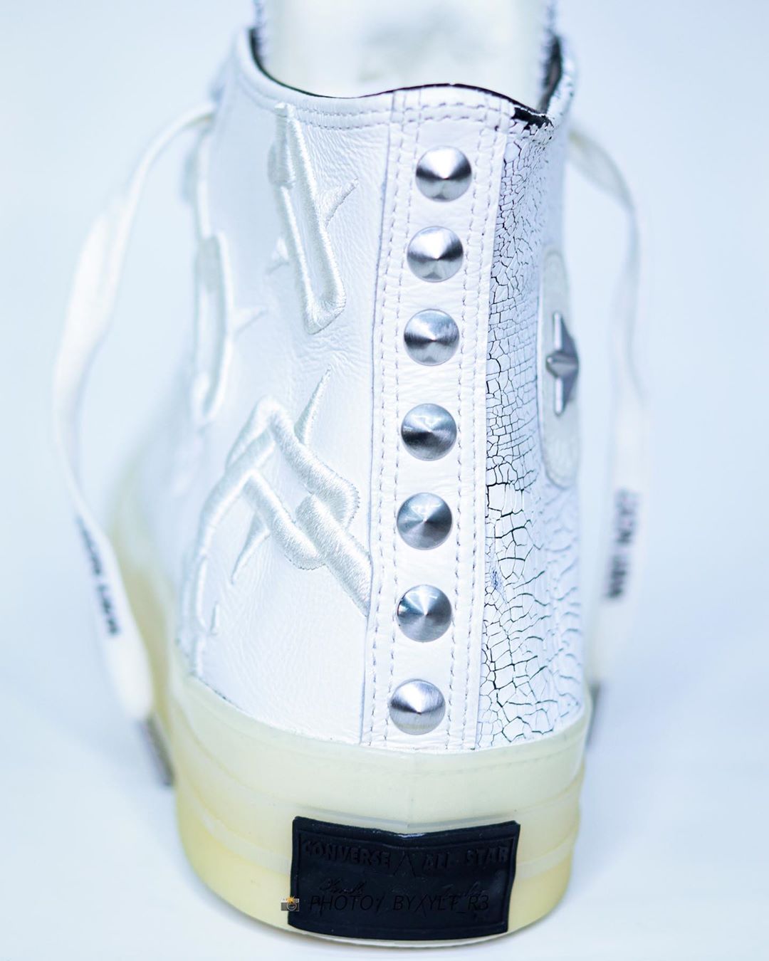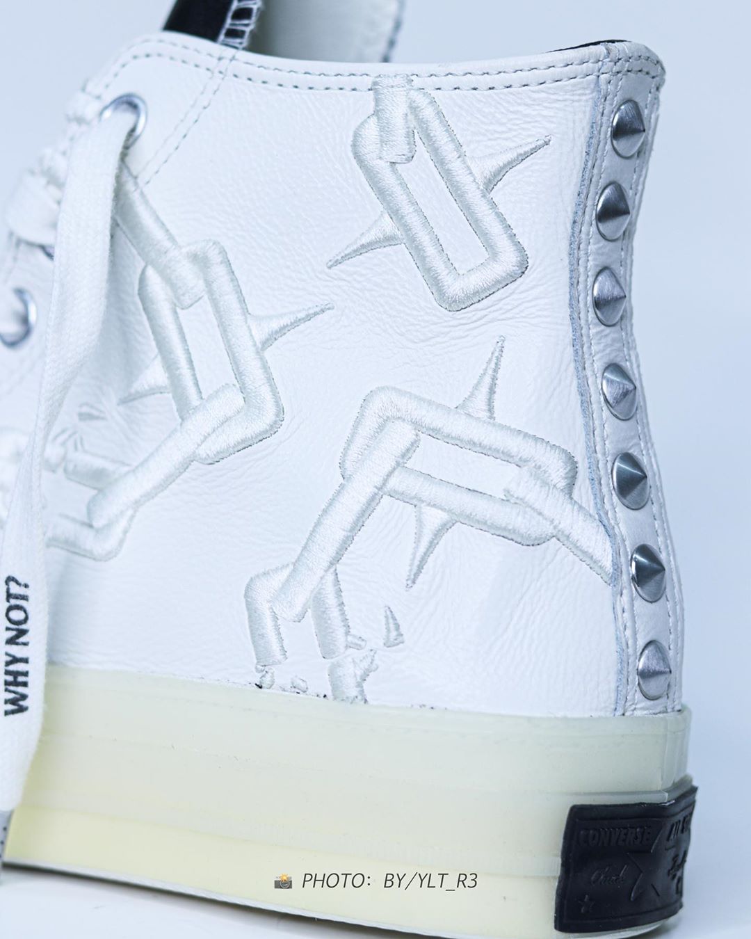外侧是铁链刺绣点缀的白色荔枝皮,内侧则是油漆爆裂效果,很可能与权志龙 Air Force 1 一样,暗藏刮刮乐设计。