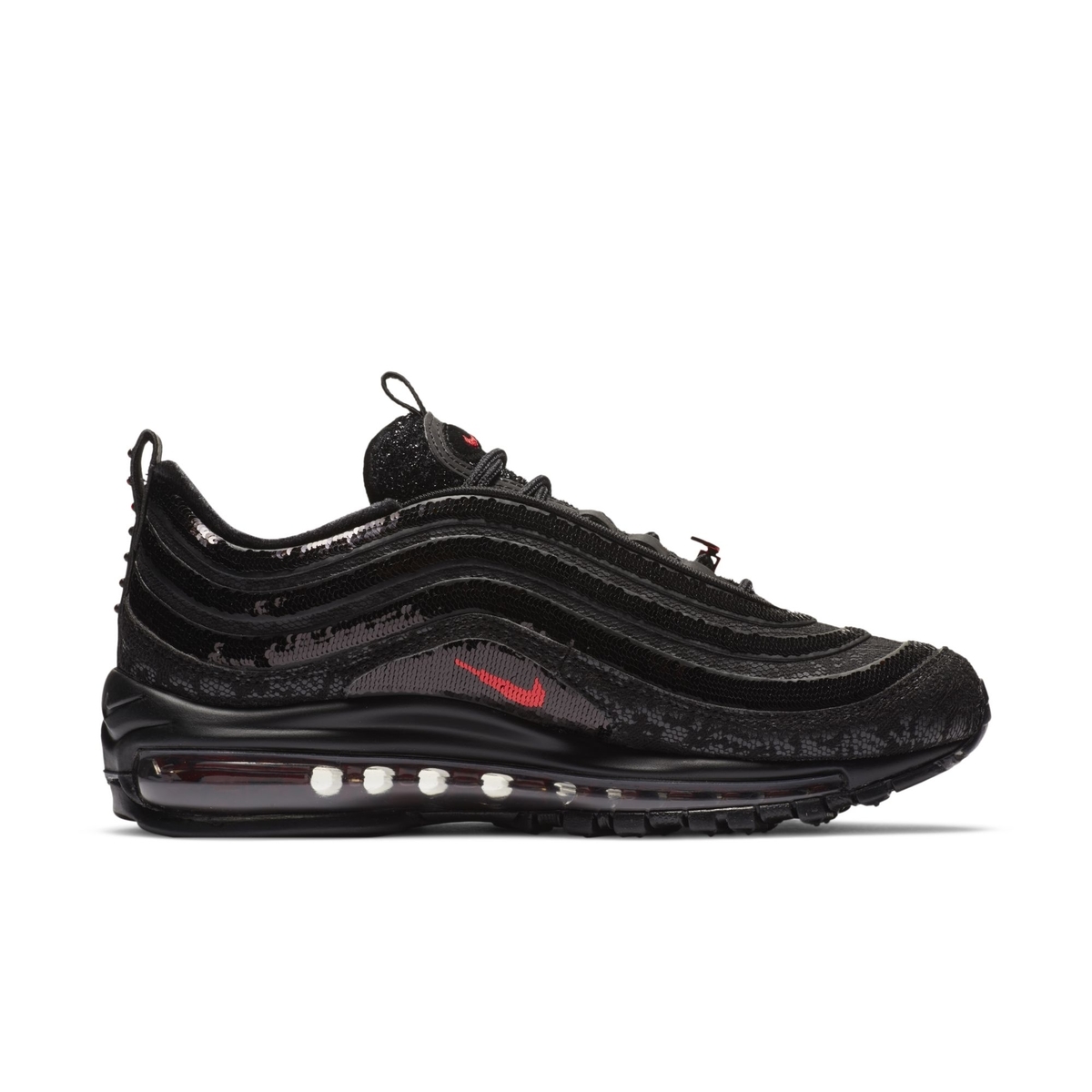 虽然整体看上去是一双纯黑色鞋款,但细节中却蕴含了不少玄机。首先鞋面是以黑色蛇纹与黑色亮片拼接打造,鞋舌则覆盖了一层黑色闪粉,整双鞋都呈现出 BLINGBLING 的视觉效果。