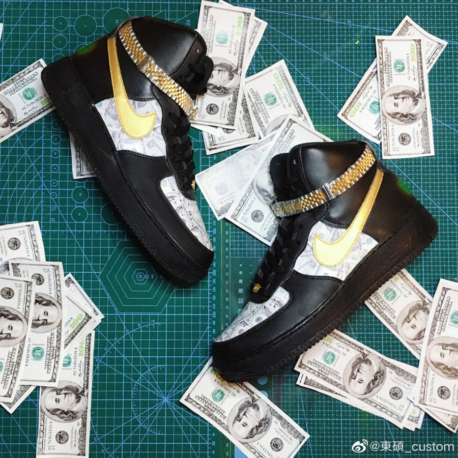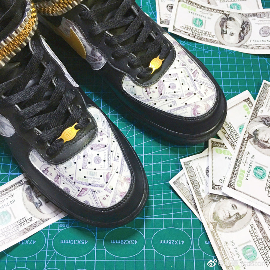 纯黑装扮的 Air Force 1 在鞋头与鞋身中部,都换上了奢靡的美金花纹妆点。