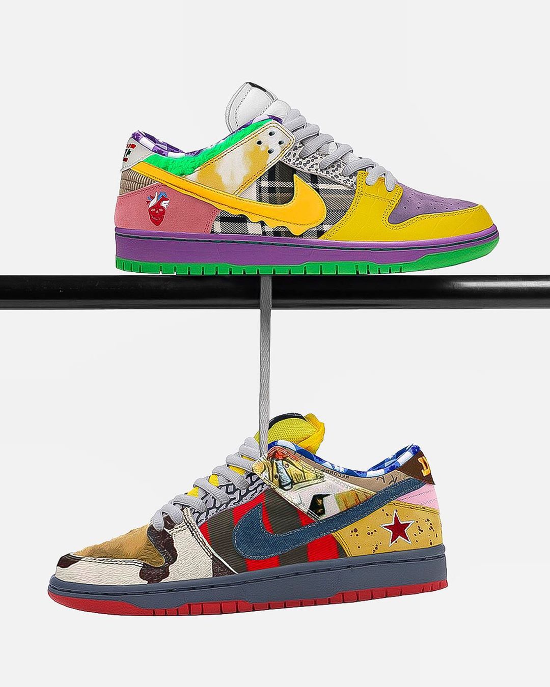 整双鞋的设计元素为丰富,将众多 Nike Dunk SB Low 的天价配色融为一体,视觉效果和颜值看起来都与 Nike 官方的那双 “What the”Dunk SB Low 不相上下。