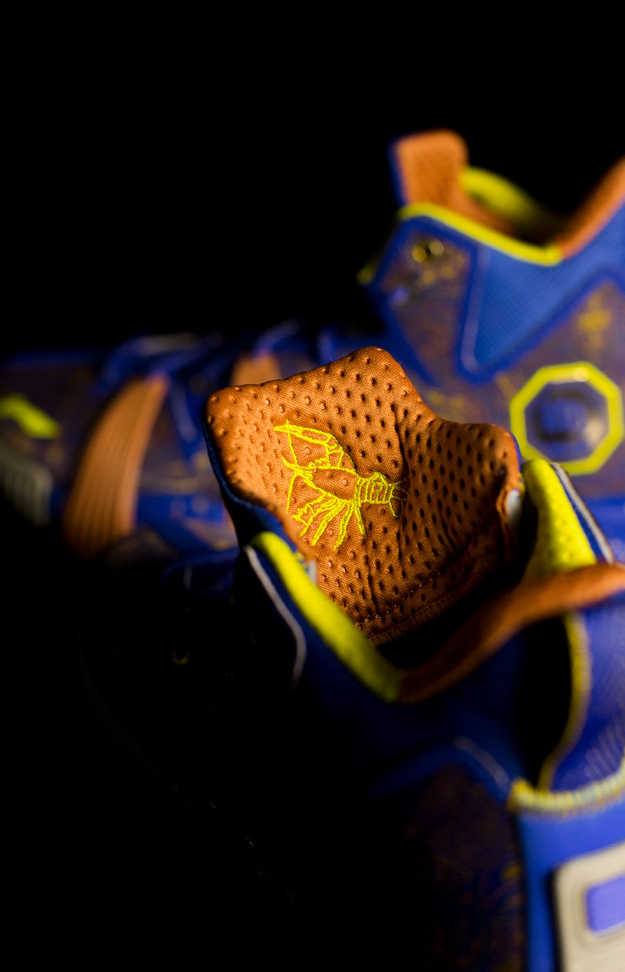 球衣同样是 “惟楚有材” 主题,采用与球鞋相同的构色搭配,亮蓝色基底上装饰着醒目黄色花纹,以小龙虾、铜钱及槟榔等元素组成。