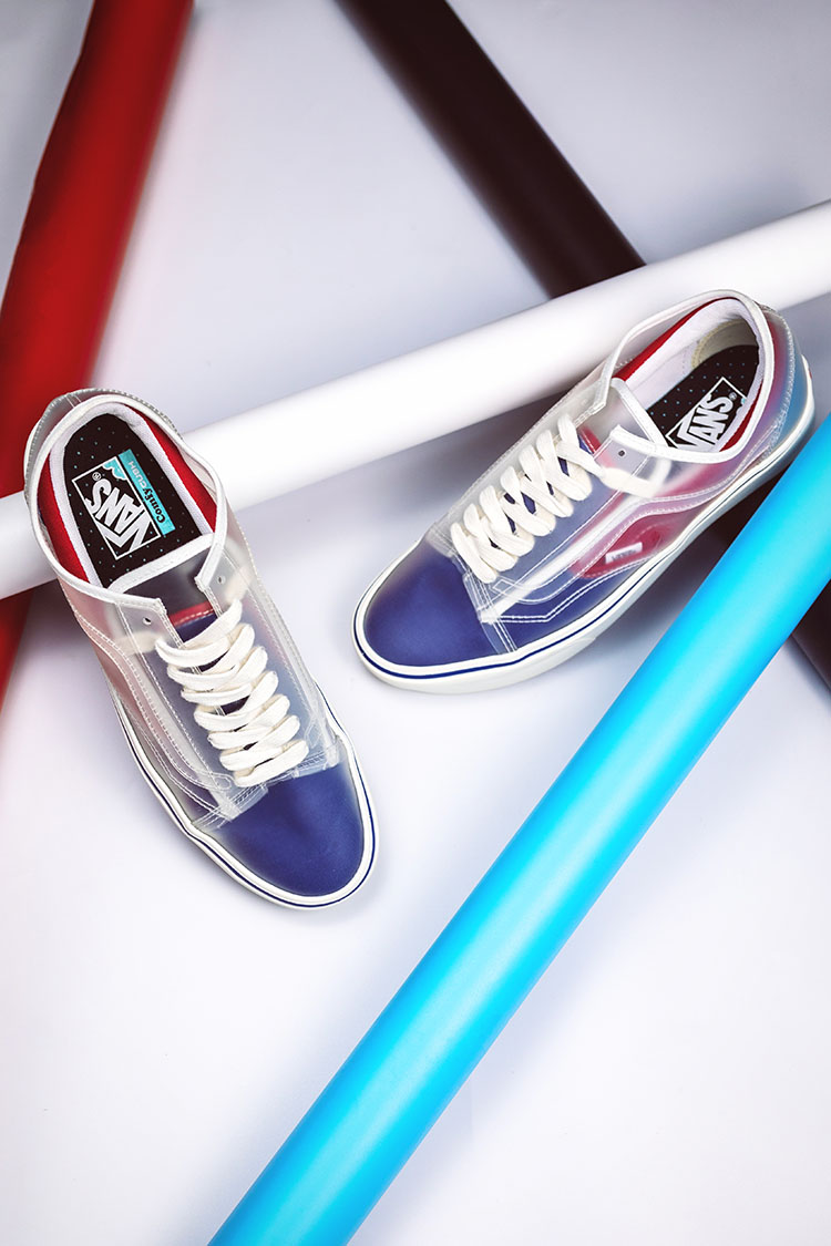 整双鞋采用双层鞋面设计,外层透明材质采用 Old Skool 的造型,仔细观察就会发现,内层是 Slip-On 的鞋面。