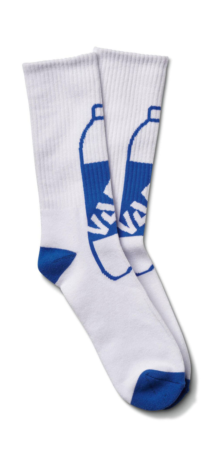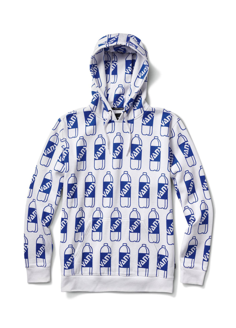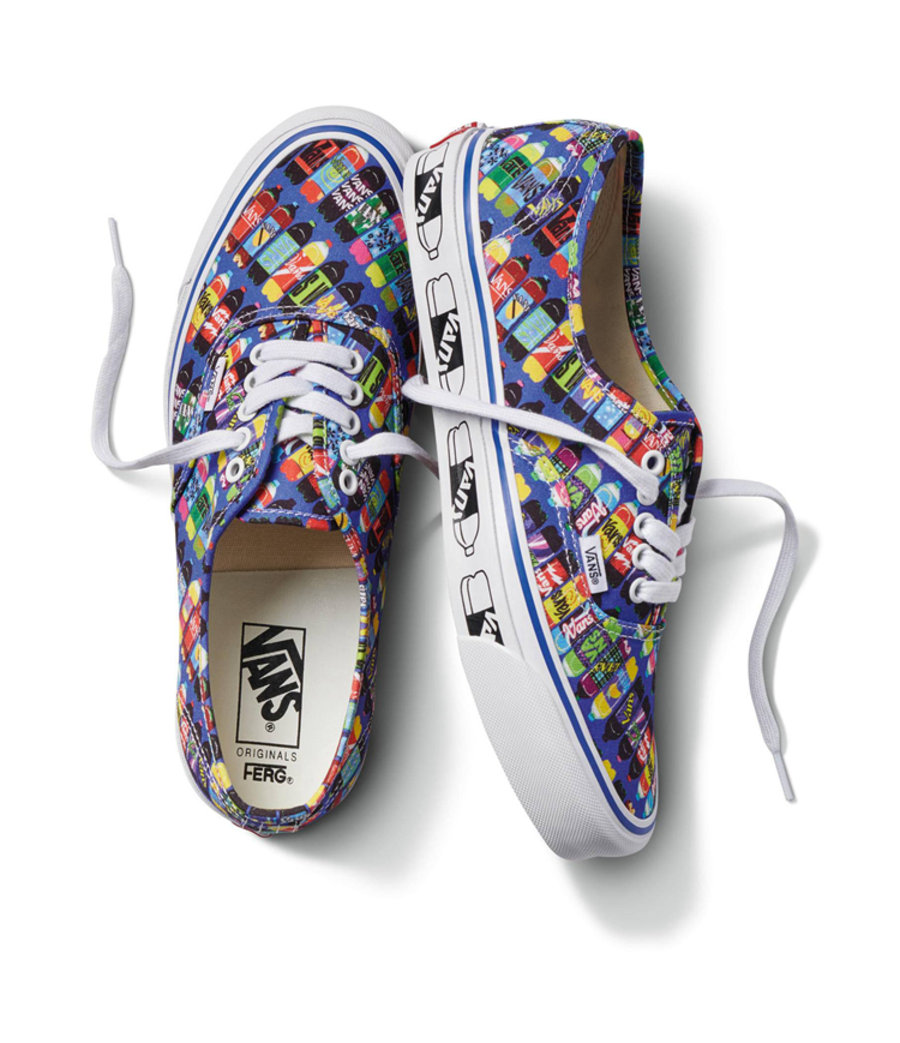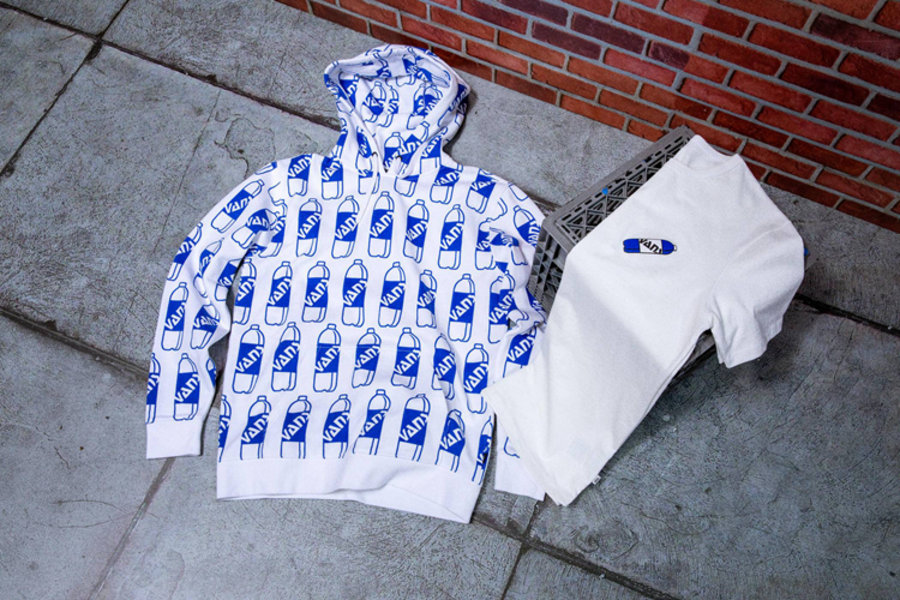 两组设计主题分别展现出 Fergus Purcell 对于自己生活中的记忆,其中一组以汽水瓶为灵感,蓝色鞋面上布满 “Vans” 牌汽水,同时中底也带有汽水瓶图案。