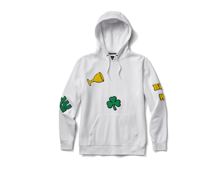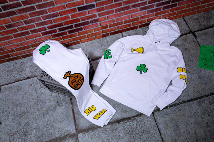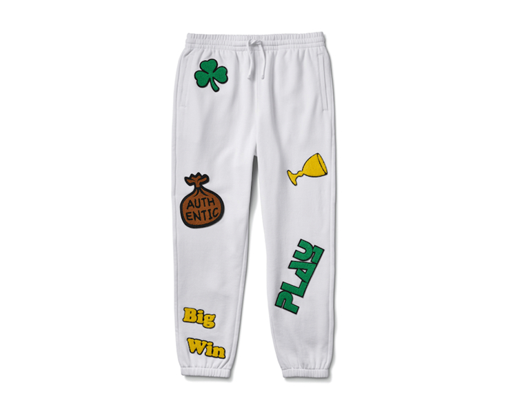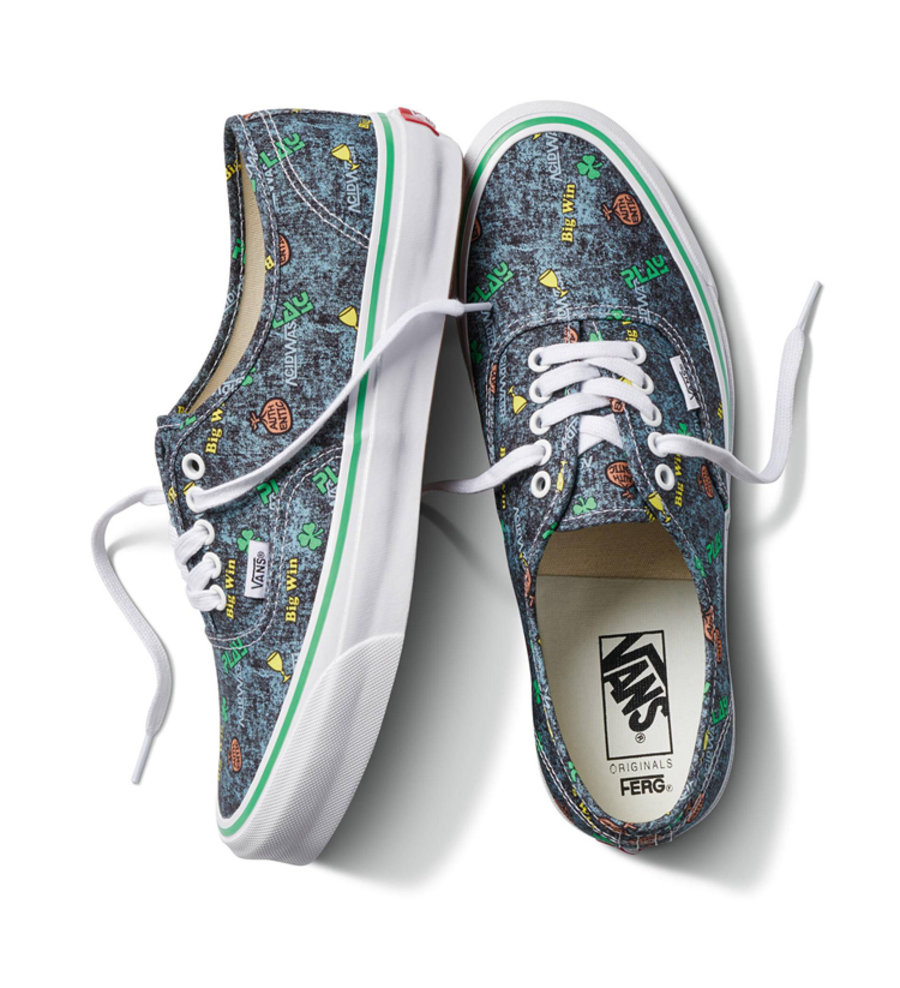 另外一组主题则是来自 Fergus Purcell 记忆中的酸洗 Vans 造型,可以看出酸洗风格的鞋面上布满了钱袋、幸运草、“PLAY” 和 “Big Win” 奖杯图案。