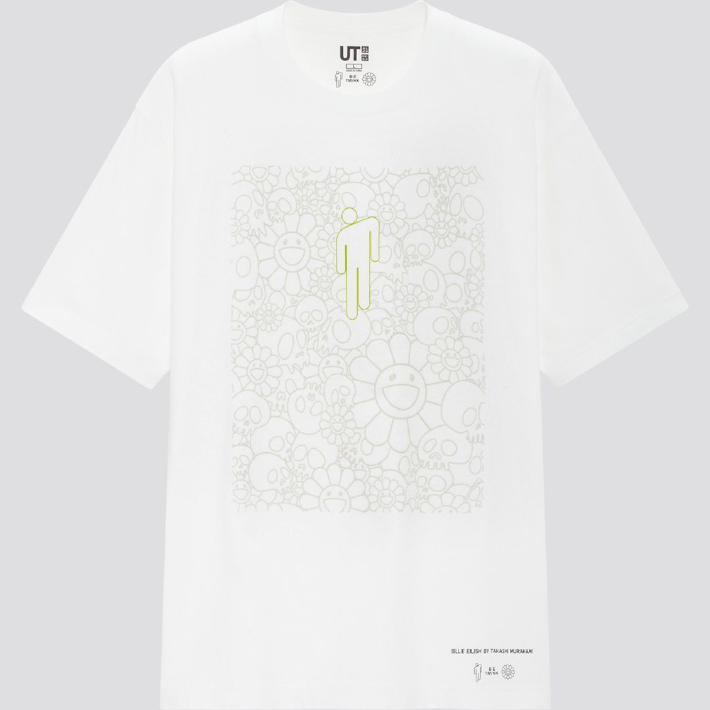 仍然以村上隆最具标志性的太阳花作为主视觉元素,同时结合了 BILLIE EILISH 字样以及碧梨个人品牌 blohsh 的 “高低肩” 人像 Logo。