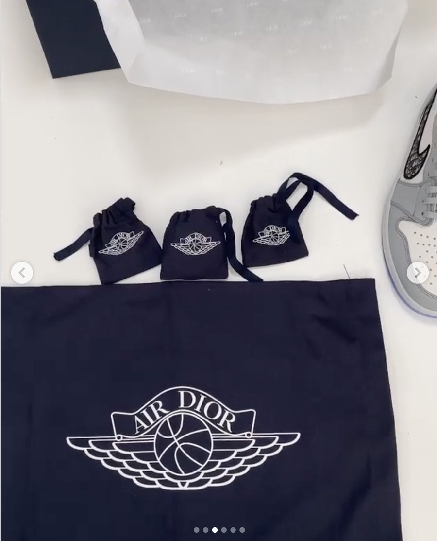 鞋盒内除了大家都已经看过很多遍的 Dior x Air Jordan 1 之外,黑色鞋袋和金属吊牌等配件还是首次曝光,将这双奢侈品级联名的高级与奢华彰显得淋漓尽致,这样的规格的确是有点 Dior 联名那味儿了!