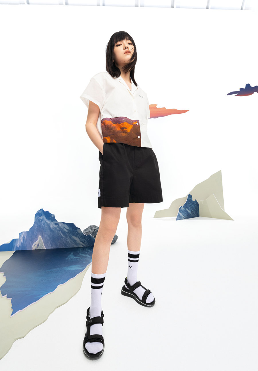服装方面包含 Tee、Oversize 衬衫、阔腿裤等日常休闲单品,以柔和清爽的色彩搭配和极具新鲜感的设计,营造出率性利落的时尚姿态。