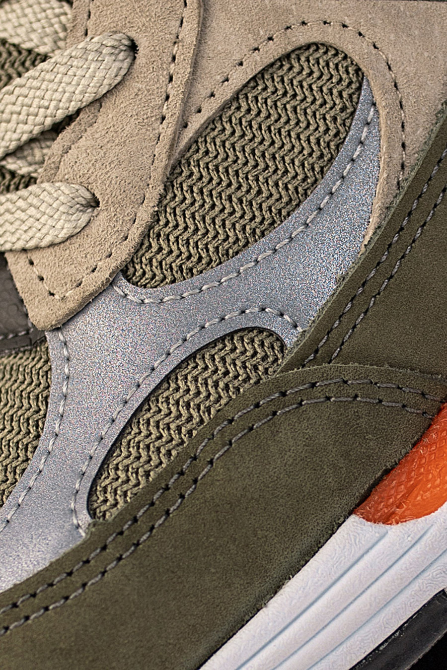 鞋身大面积灰色、橄榄绿色麂皮材质为整双鞋提供十足复古跑鞋质感。鞋面采用纹路清晰的棉料材质打造,搭配面积更大的 3M 反光细节,不得不说这是一双好鞋。