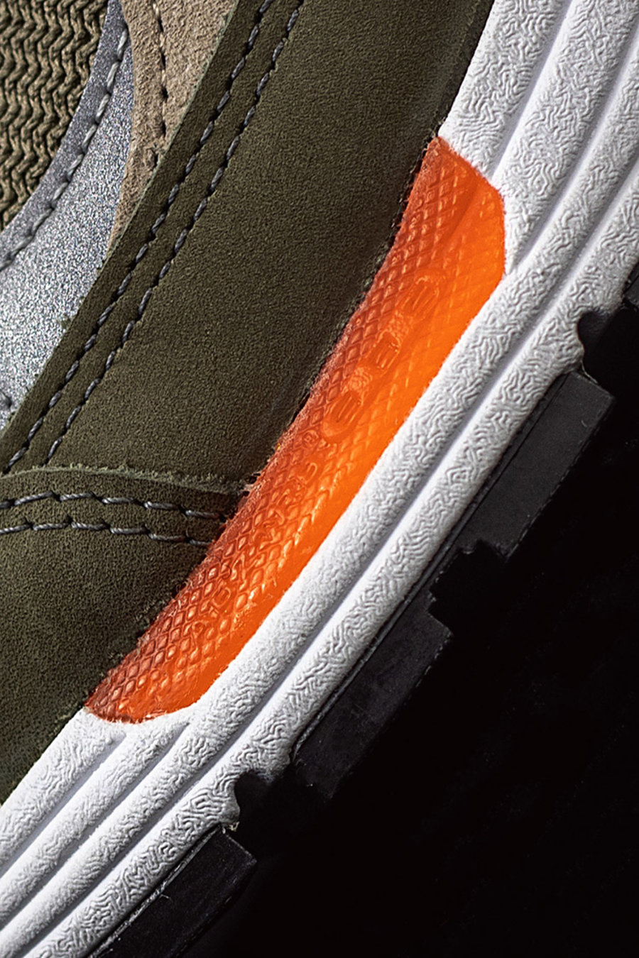 调教相当沉稳的灰绿色鞋身搭配鲜艳的橙色细节,在近几年来 WTAPS 产品身上都可以看到这样的色彩设计。