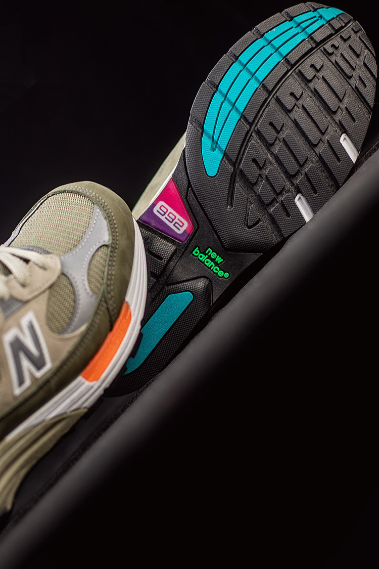外底湖水蓝色部分、紫色粉色 992 模块以及绿色 New Balance 字样与中底橙色一样,为整双鞋注入亮眼细节。