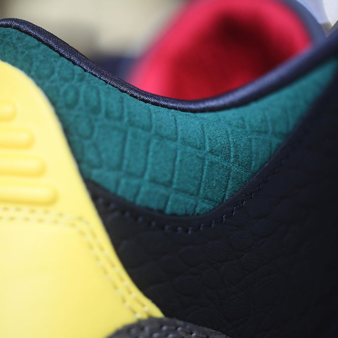 鞋带扣还以暗红色、明黄色点缀,红色 Jumpman Logo,绿色鞋领点缀,整体质感细腻高级。