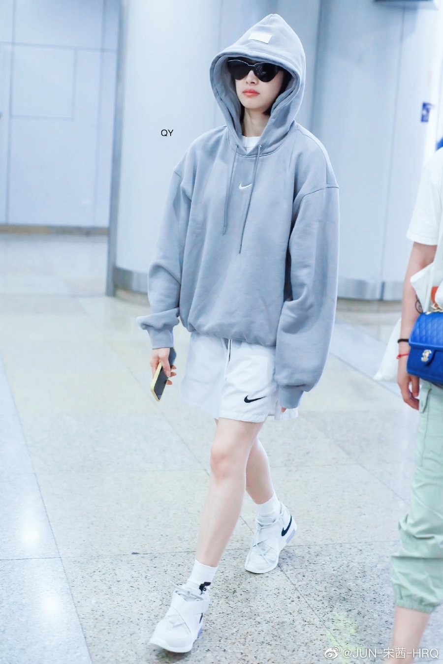 而她的机场街拍则更百变了,比如超 oversized 的 Fear of God 联名帽衫,搭配 Air Fear of God Raid。