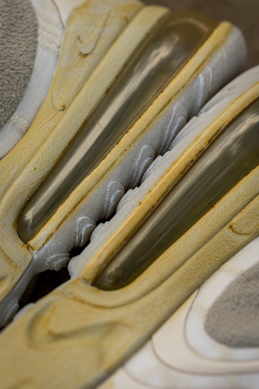 具体在于中底采用原色示人,向我们展示出将来成人鞋款完全褪色后的面貌。