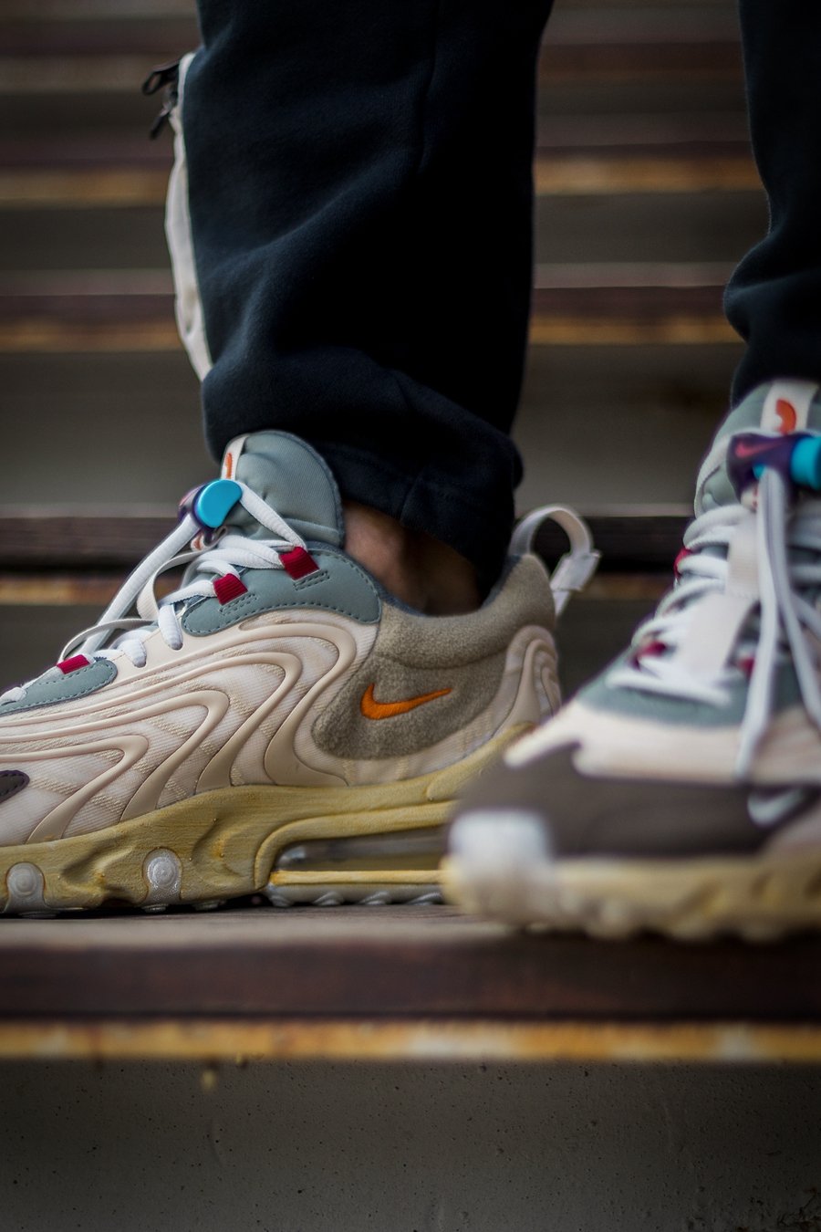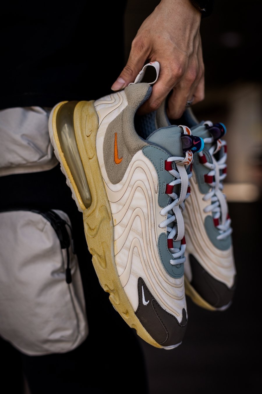 回到鞋款本身,本次联名基底 Nike Air Max 270 React ENG 早已上市,而 Travis Scott 还是在原有基础上加入了许多个人的 “小心思”。