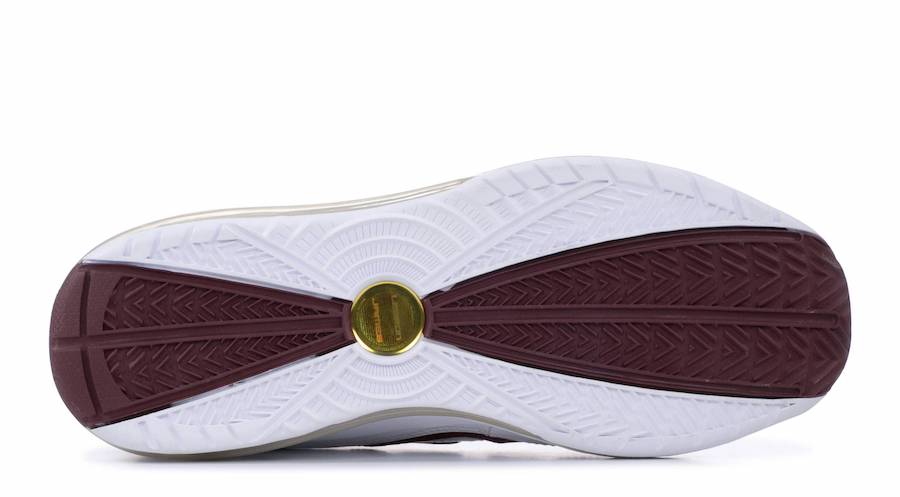 鞋身以酒红和白色为主色调,牛巴革材质的应用增强了华丽质感。