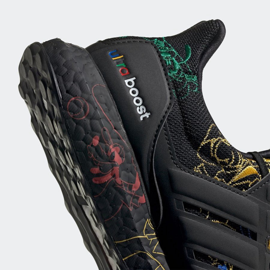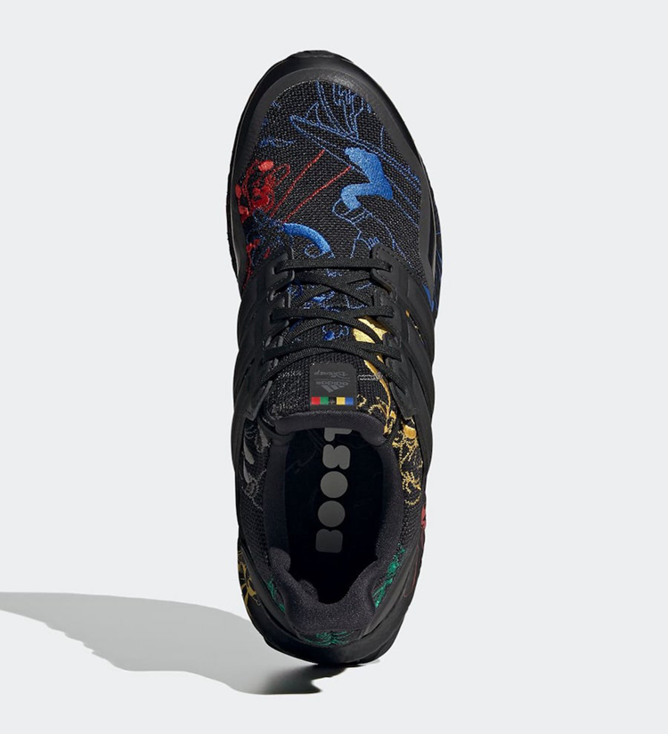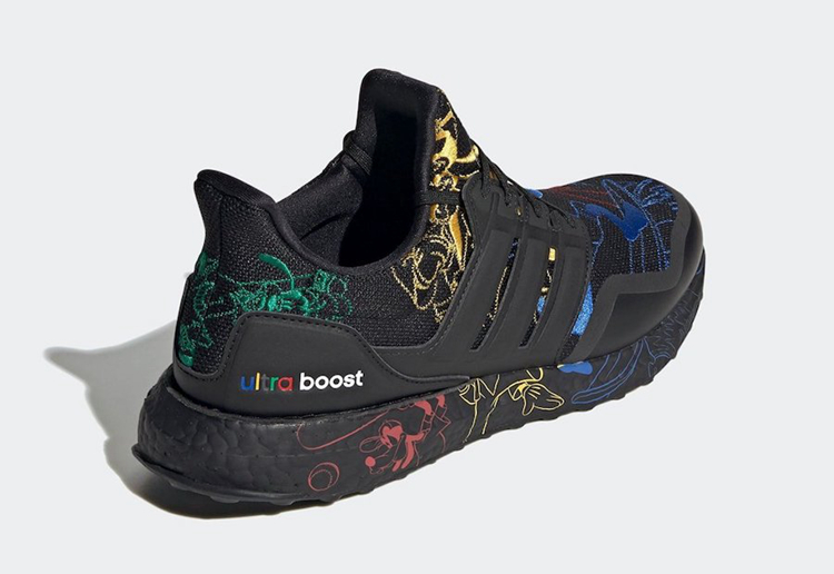 两款鞋均以 Ultra Boost 为设计蓝本,其中一款以黑色为主调,热熔以及编织材质打造鞋身,金色、蓝色、红色以及绿色的高飞图案呈现在鞋面以及黑色 Boost 中底上,带来十足个性的装扮。