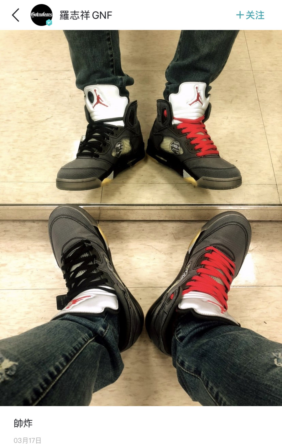 罗志祥确实是个不知不扣的大鞋头,Travis Scott、OFF-WHITE 的联名几乎都有,Hoka One One、Supreme x Air Force 这种小众款也都有上脚。