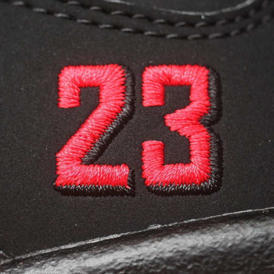 鞋面整体以黑色呈现,鞋身后部红色 23 刺绣与中底红色相呼应,标志性的鲨鱼齿装扮以银灰色泼墨填充,鞋舌则是紫葡萄装扮。