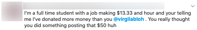 “我是一个打工每小时只挣 $13.33 美元的全职学生,而你告诉我我捐的钱都比你多。你真以为你晒出捐这 $50 美金值得一提吗?”