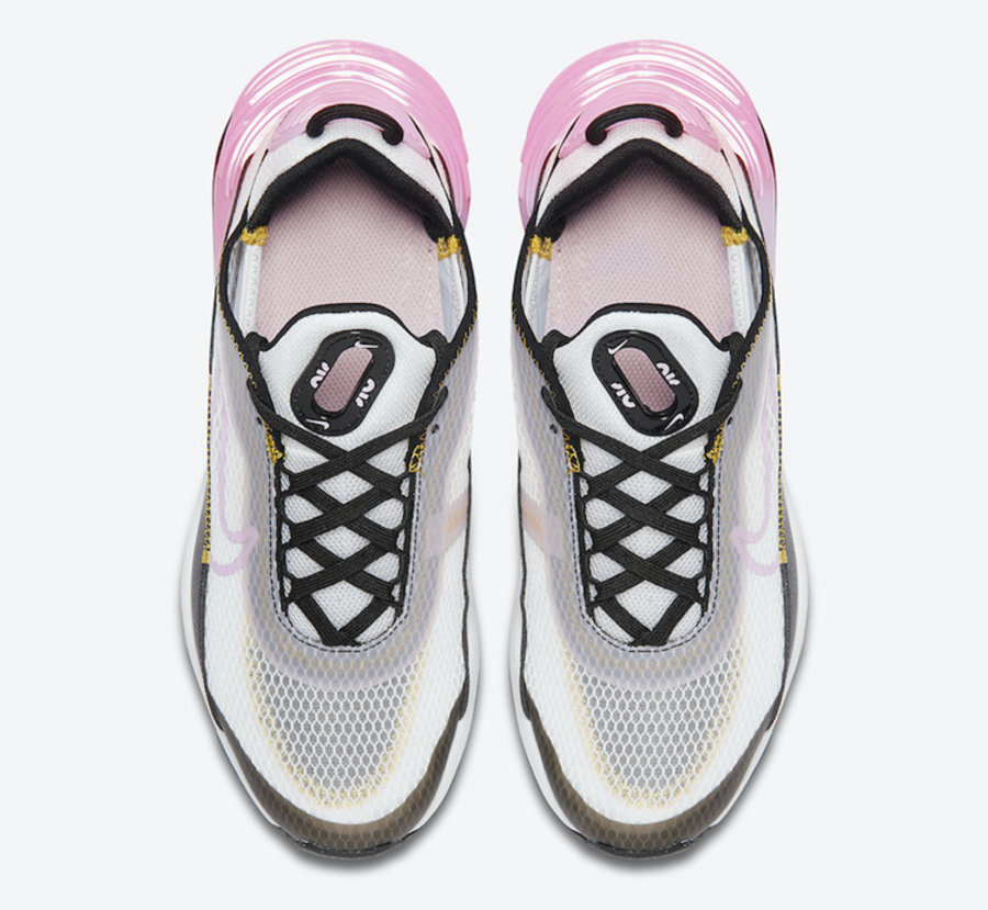 同时侧身采用相同粉色勾勒出 Swoosh Logo,鞋帮领口位置还有黄色车线点缀。