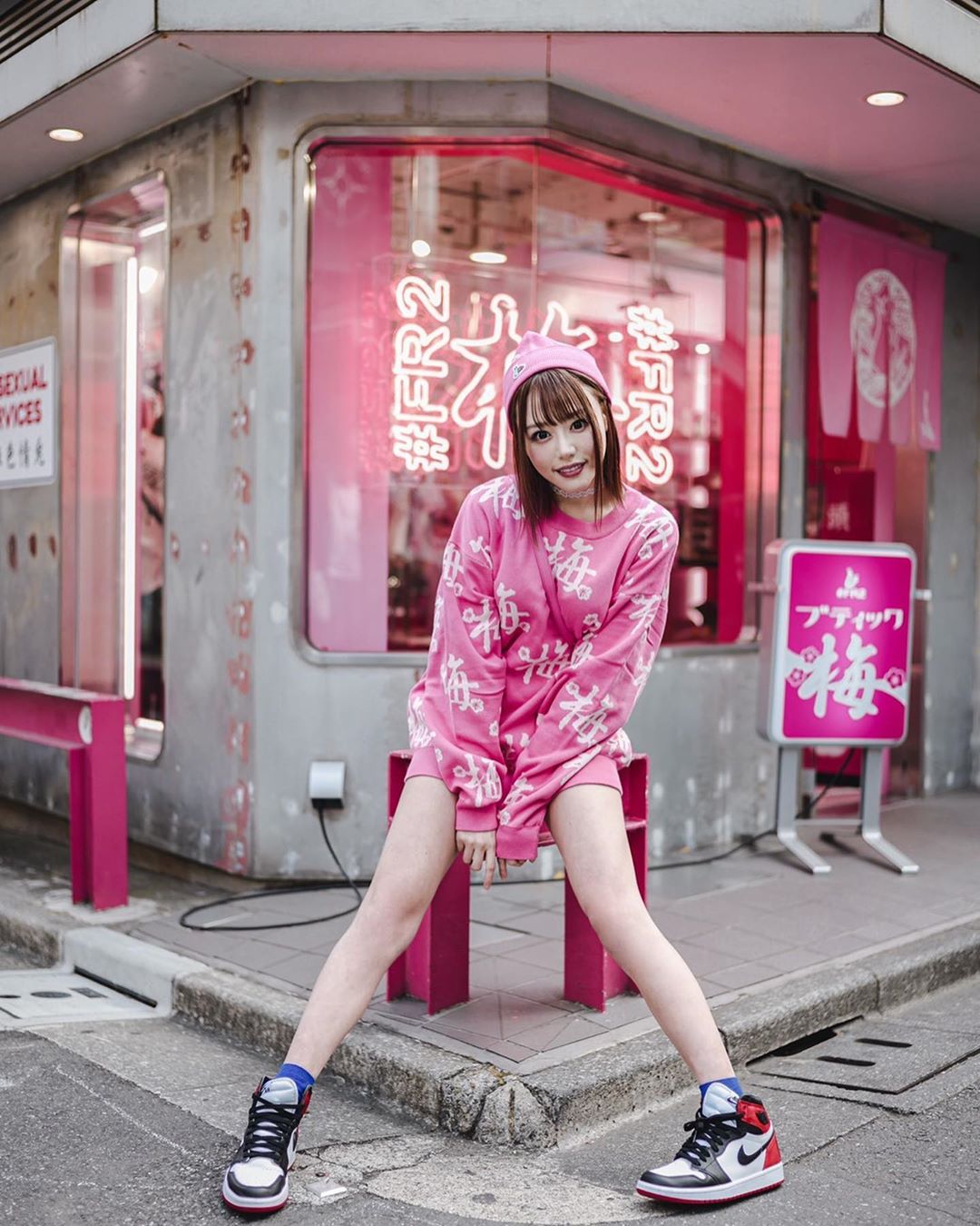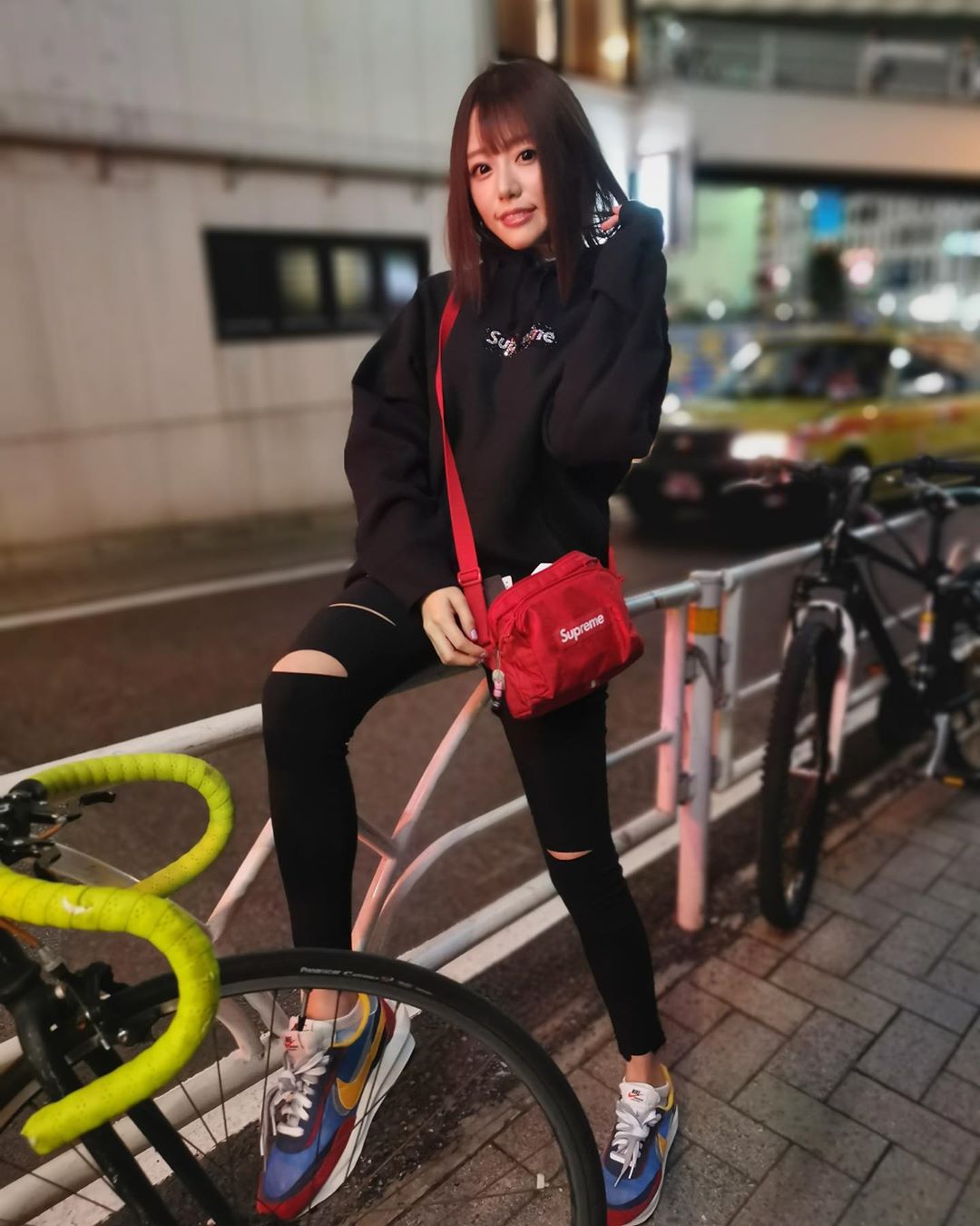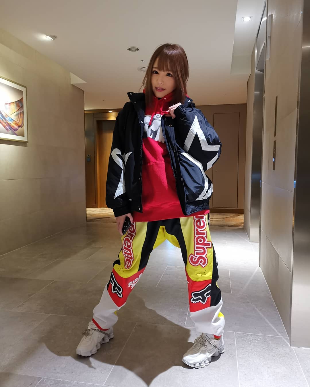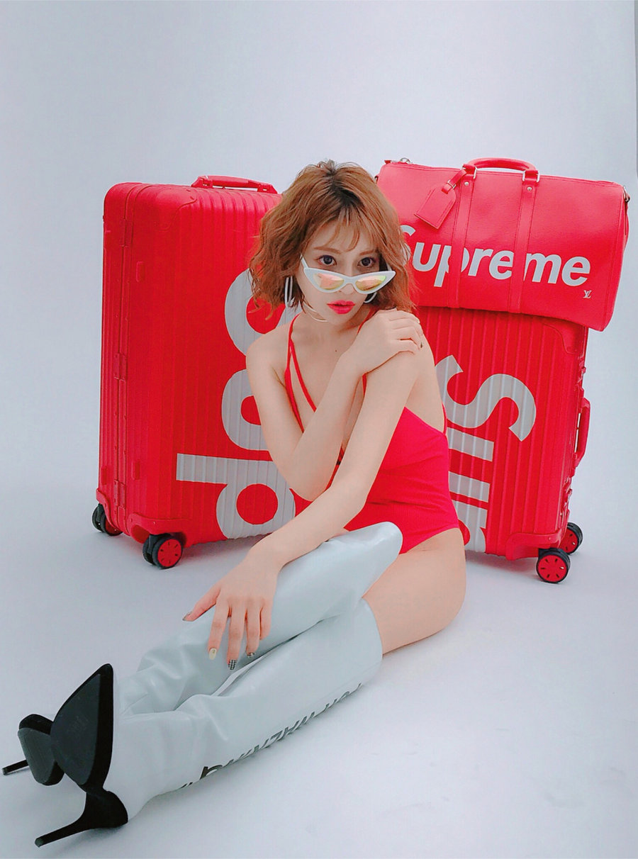 风格多变的明日花老师还有真潮流女神的一面,你能在她身上找到各种 Supreme 单品,简直就是街头与性感的结合体。