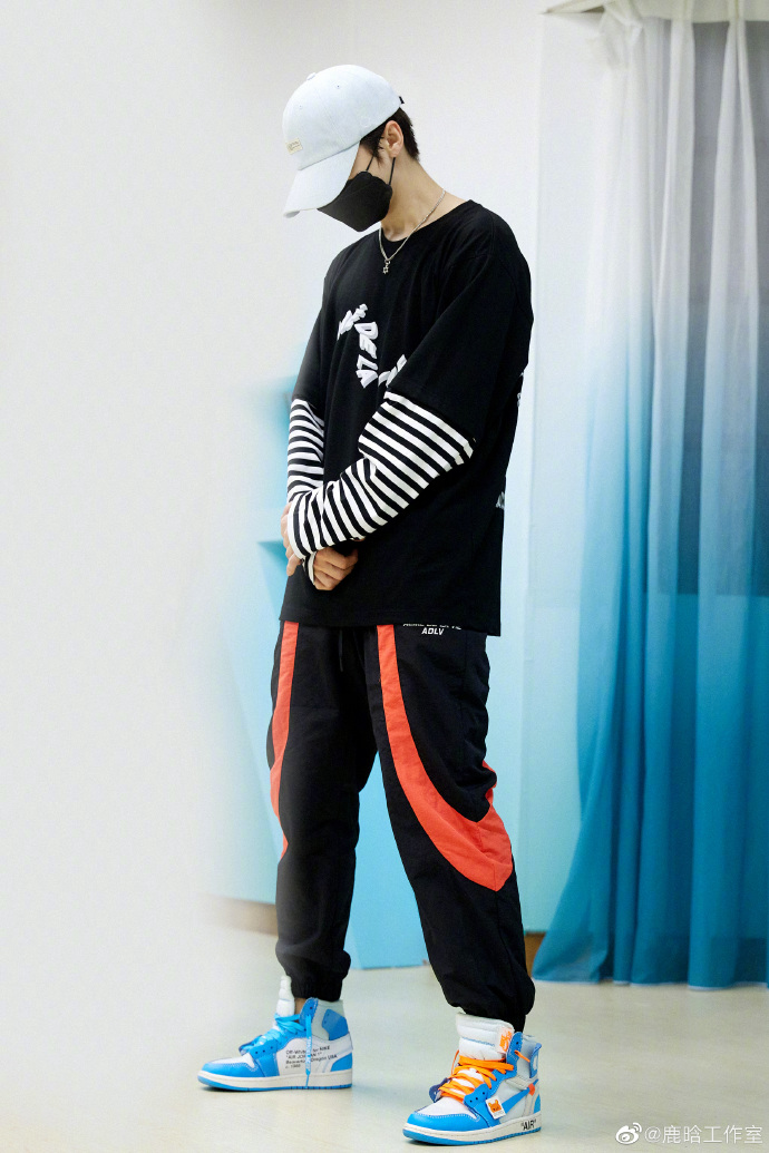 随后几日在练习室还上脚了北卡 OFF-WHITE x Air Jordan 1,鸳鸯鞋带非常吸睛,目前男款市价接近万元,着实不便宜。