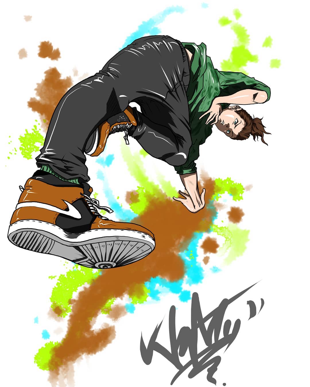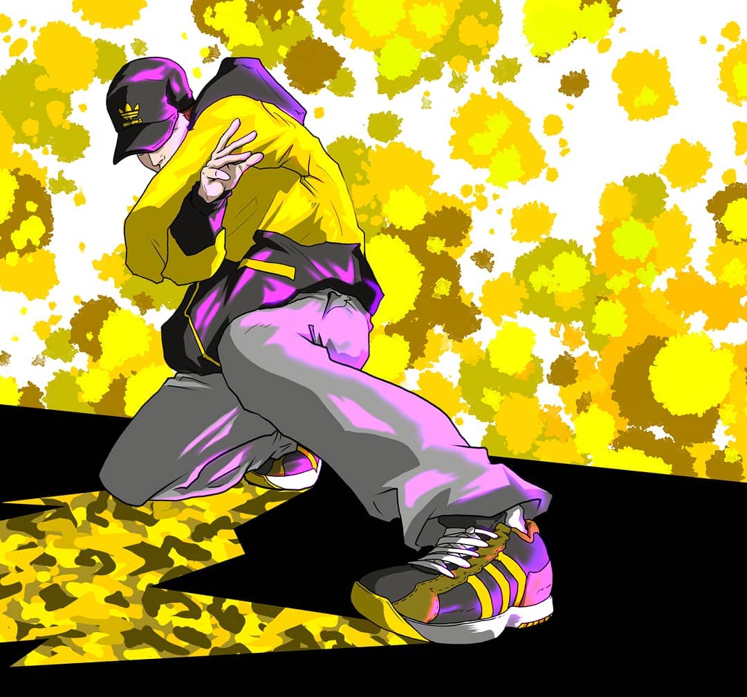 他最初的作品就是以霹雳舞为主题,以带有夸张镜头感的效果、高饱和度的色彩呈现。