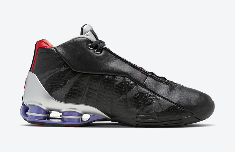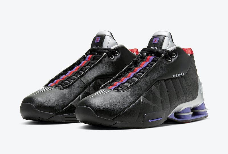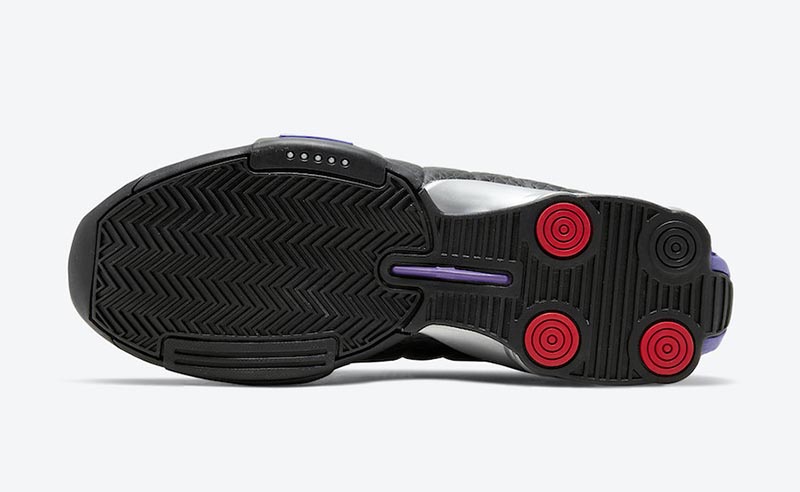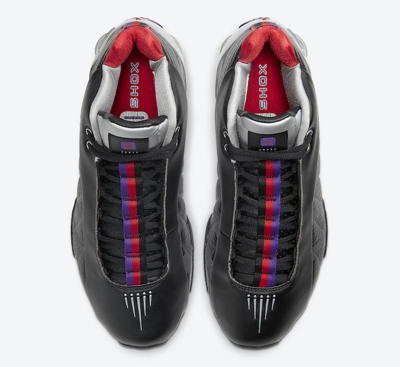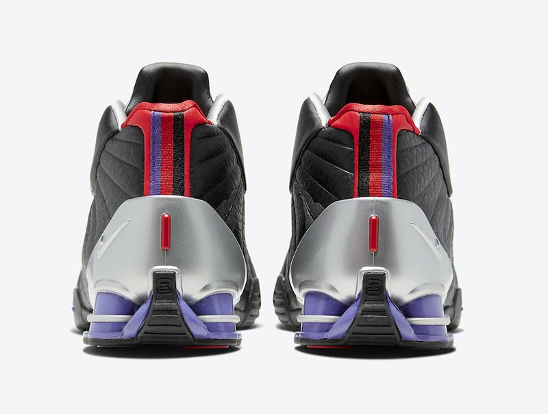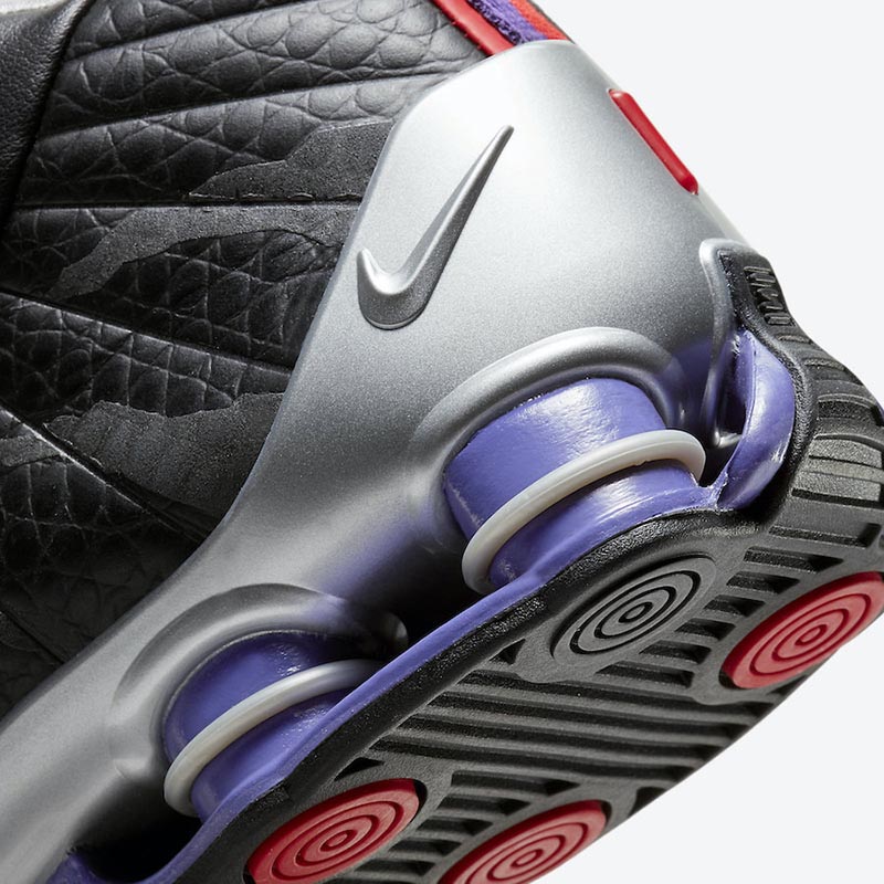 整双鞋采用一席酷黑笼罩,后跟标志性的 SHOX 气柱结构,辅以银、紫色示人。