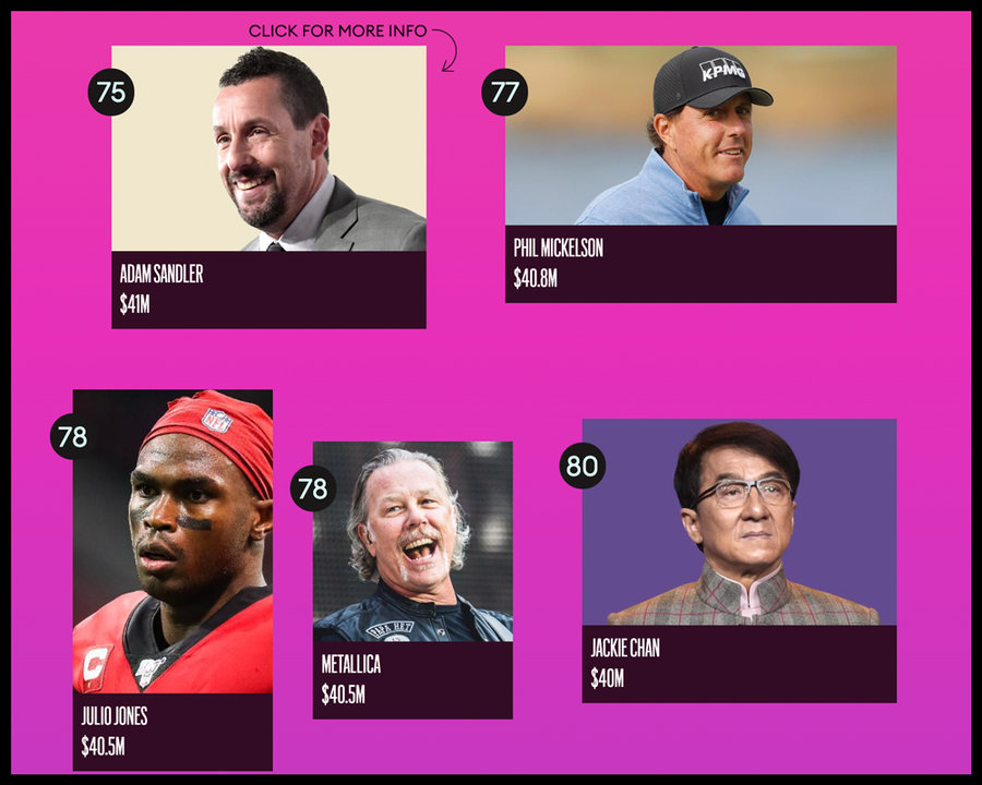 更多有关 2020 年百大名人收入详情,各位可以点击下方链接查看完整榜单!看看你喜欢的明星排第几!