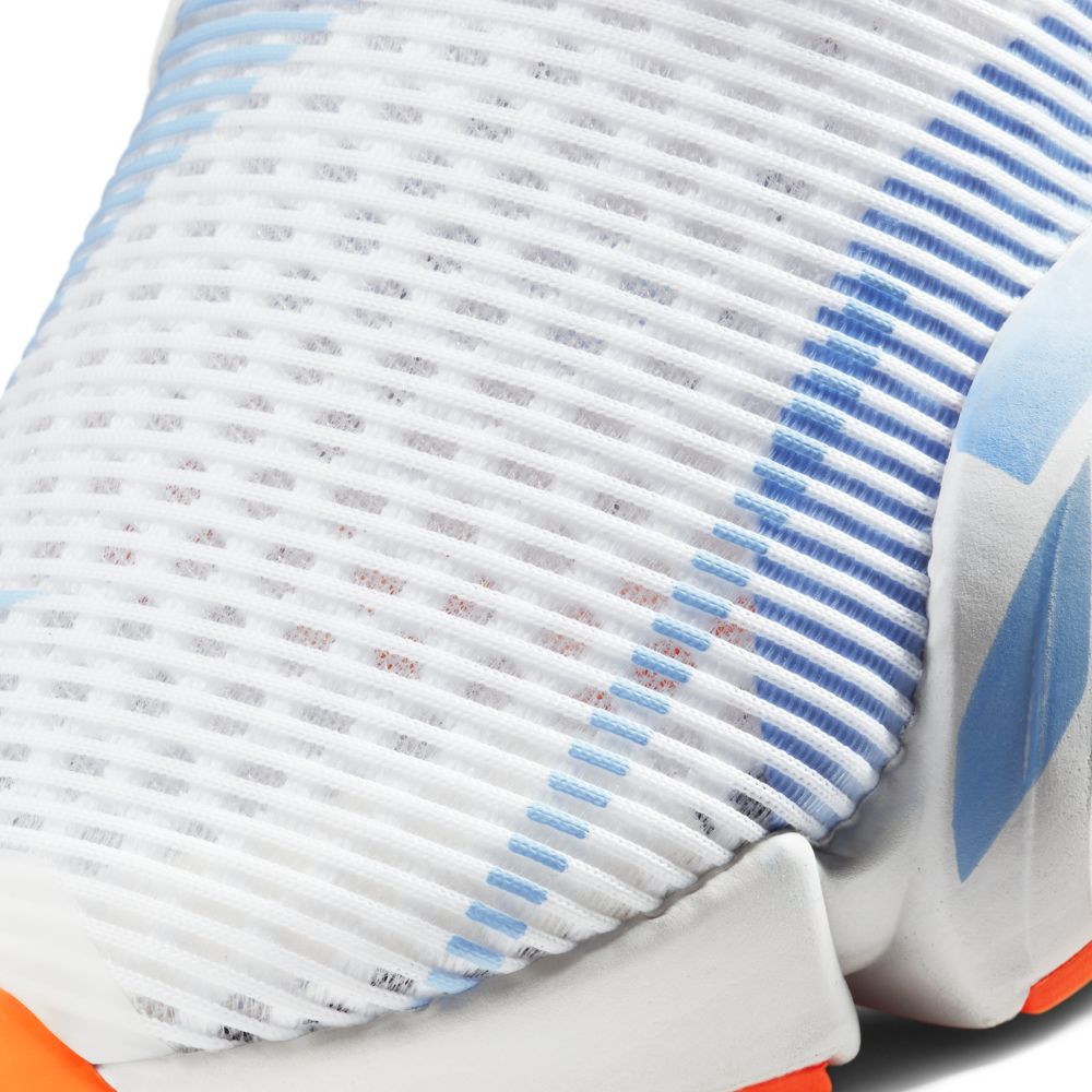 纯白色的流线型鞋身,采用透气弹性织物打造。醒目又清爽的淡蓝色 Swoosh 贯穿整个鞋面,营造出强烈的视觉冲击感。