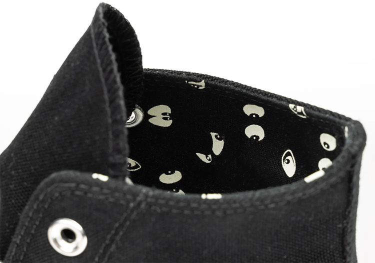 此外,内衬以弹幕式的眼睛图案呈现,后跟采用同款标签设计。