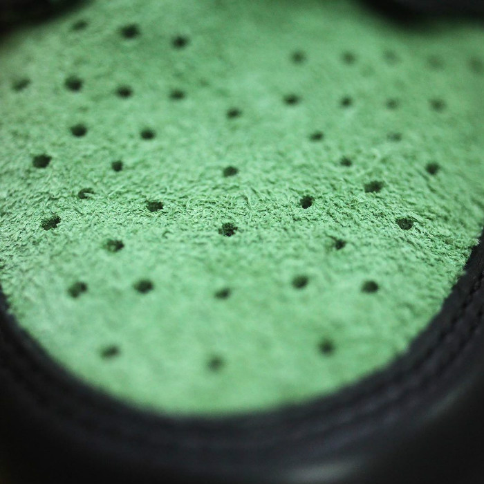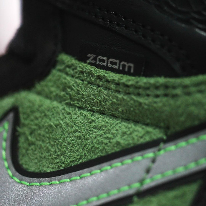 鞋身整体以黑绿为主调,鞋面采用细腻皮革与翻毛皮共同打造,呈现出更加丰富的鞋身质感。