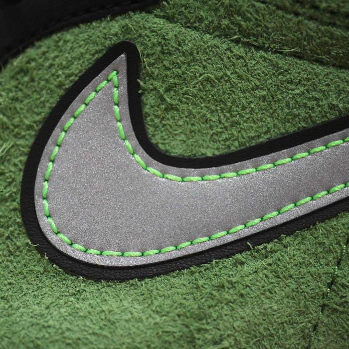 鞋身侧边银色 Swoosh Logo 采用 3M 反光材质打造,同时采用绿色车线缝制。