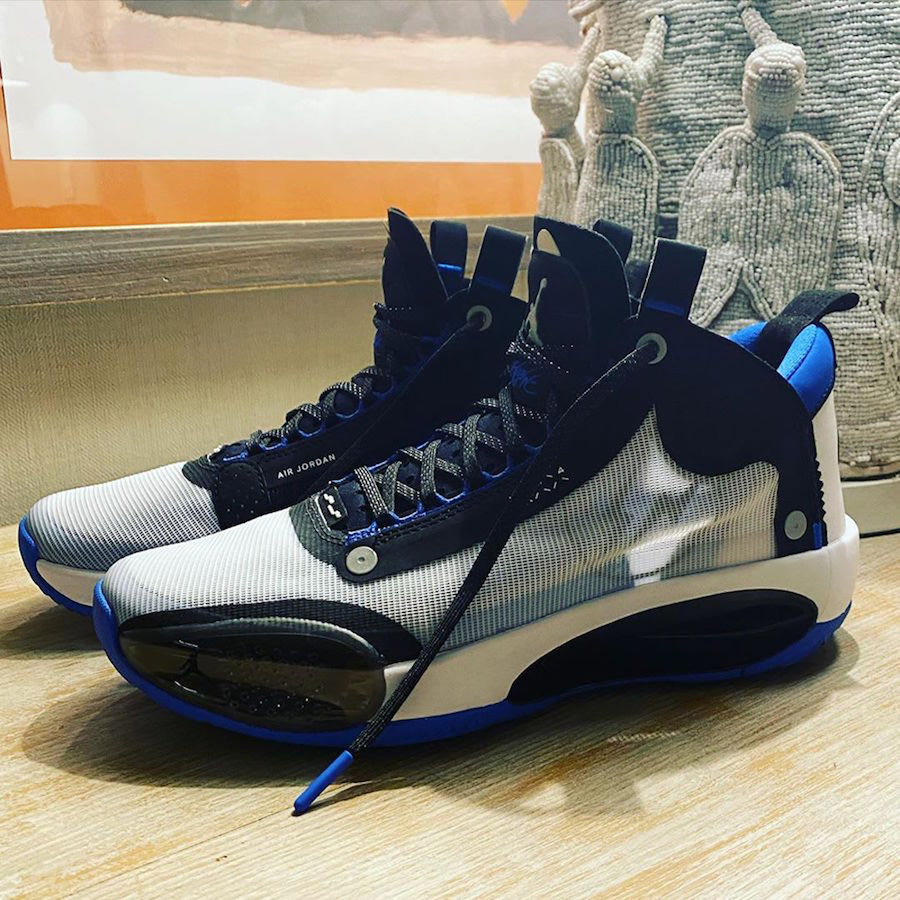 其一就是 Air Jordan 34,延续黑白蓝配色方案,中部网布材质上印有闪电 Logo。