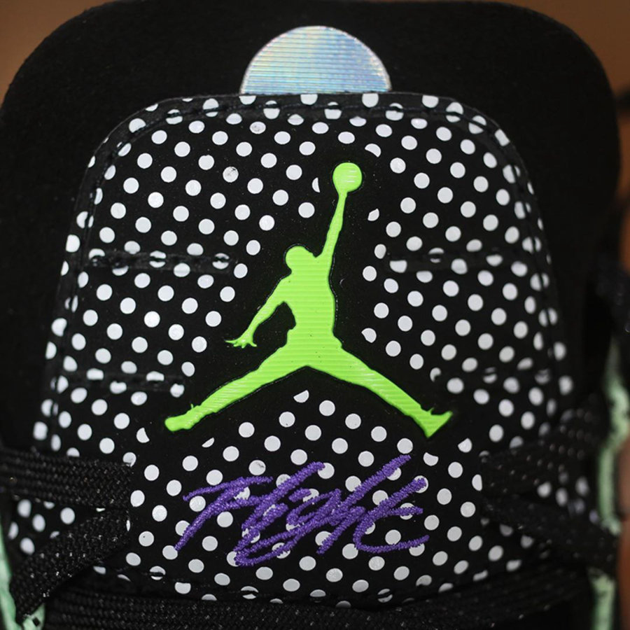 鞋舌以及鞋跟处的 Jumpman Logo 以荧光绿色呈现,与鞋面斑点呼应,吸睛效果不俗。