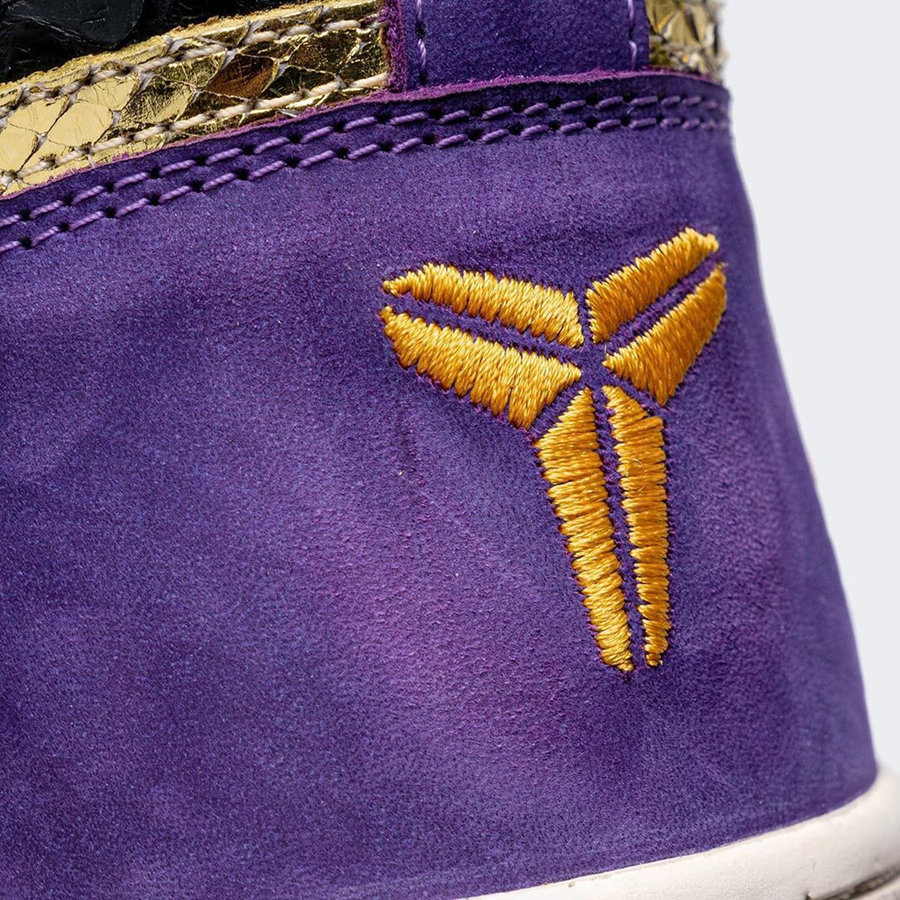 鞋身以代表黑曼巴的黑色蛇纹皮革为主体,搭配紫色麂皮和金色反光蛇纹皮料,还原湖人配色。