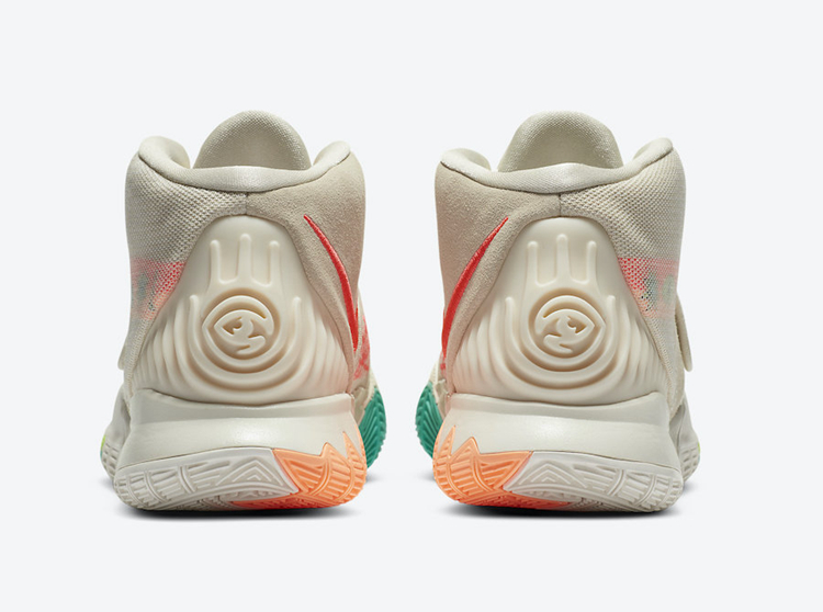 其中 Kyrie 6 “N7” 采用一袭米白色装扮鞋舌,鞋身绑带以及鞋舌位置带有橙红色细节点缀。而最大两单当属鞋帮处的民族风图腾元素。