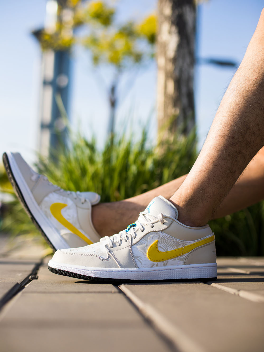 浅卡其色与白色拼接的鞋面,暗藏棕榈叶图案,鞋舌与 Swoosh 都是以类似丝绸的材质打造,鞋舌上湖绿色的飞人 Logo 与黄色的 Swoosh 碰撞组合,令色彩更加突出鲜明。