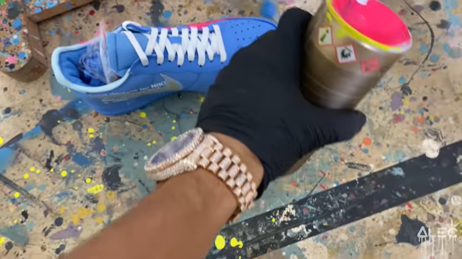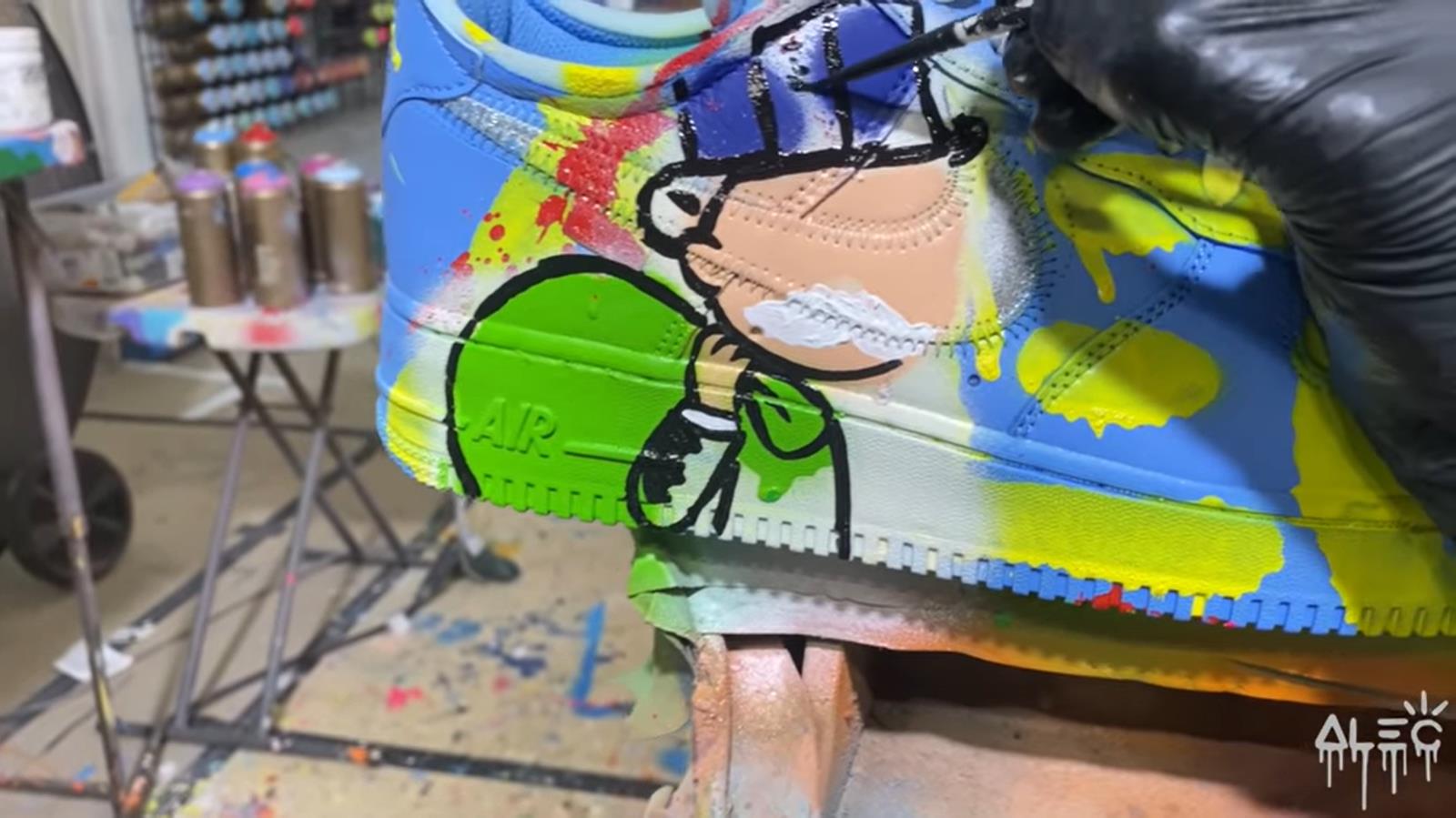 Alec 选以价格不菲的 Nike Air Force 1 “MCA” 为画布,没有草稿直接作画,上手第一笔就让小编感到非常揪心。