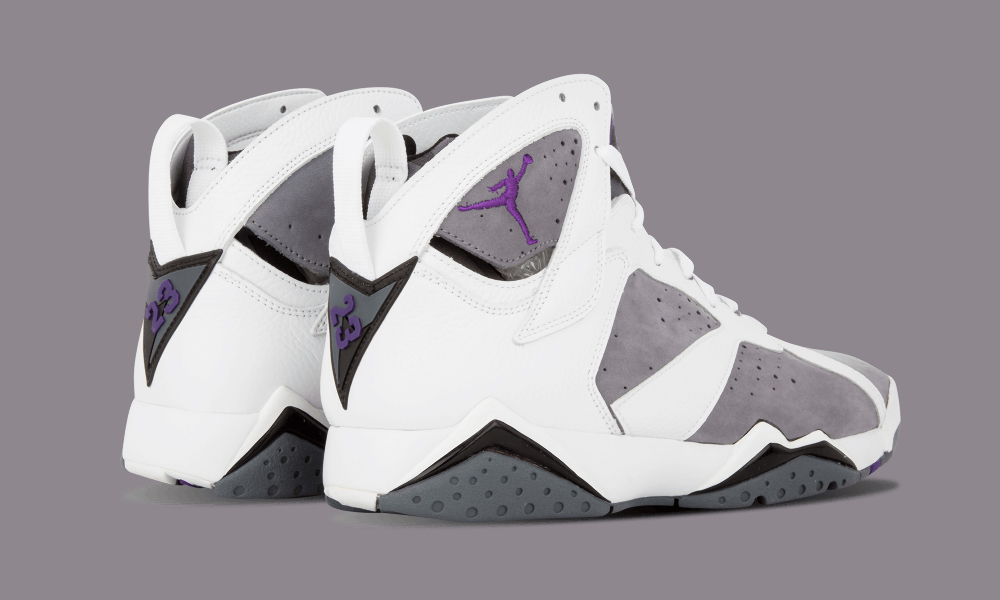 鞋舌、鞋帮侧面及后跟位置分别以罗兰紫色妆点 Jordan、Jumpman、23 Logo。
