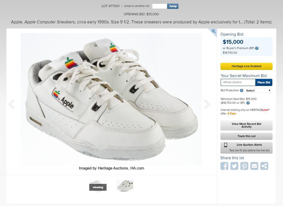 此前一双完美品相的苹果球鞋在佳士得拍卖,起拍就高达 15000 美元,最终成交价更高达 30000 美元(约人民币 21 万元)!
